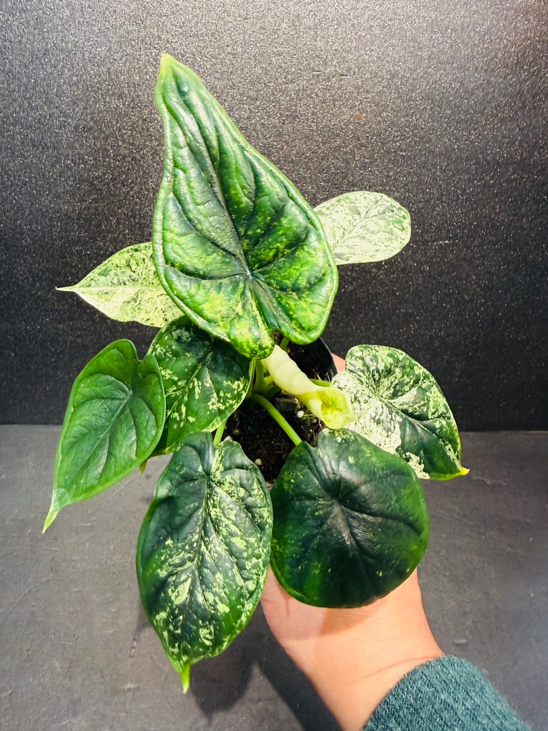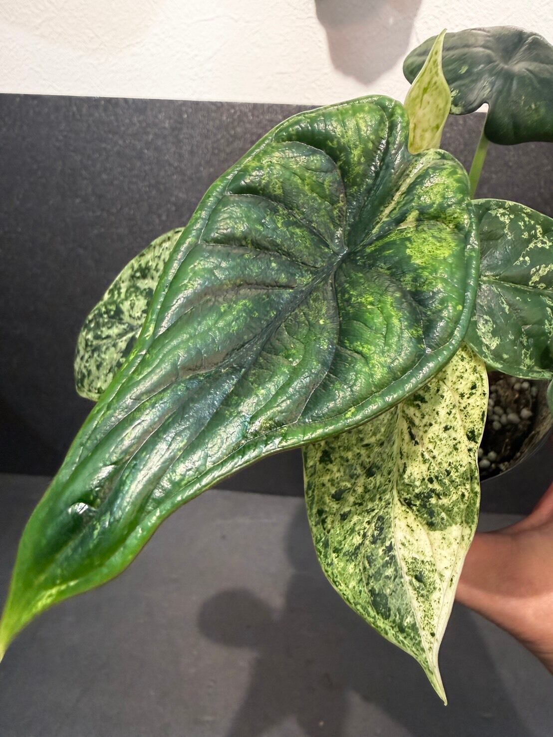 「ドラゴンの鱗」のような質感: これは通常のアロカシア・ドラゴンスケールと同様で、葉の表面に立体的な凹凸があり、ゴツゴツとした質感は健在です。