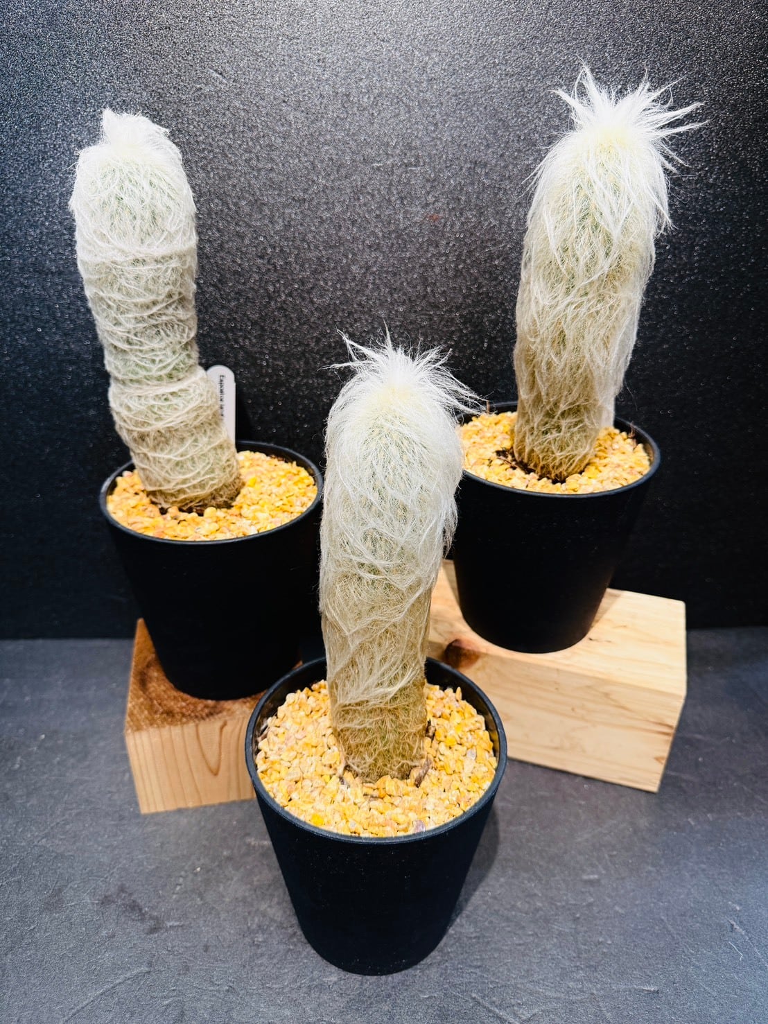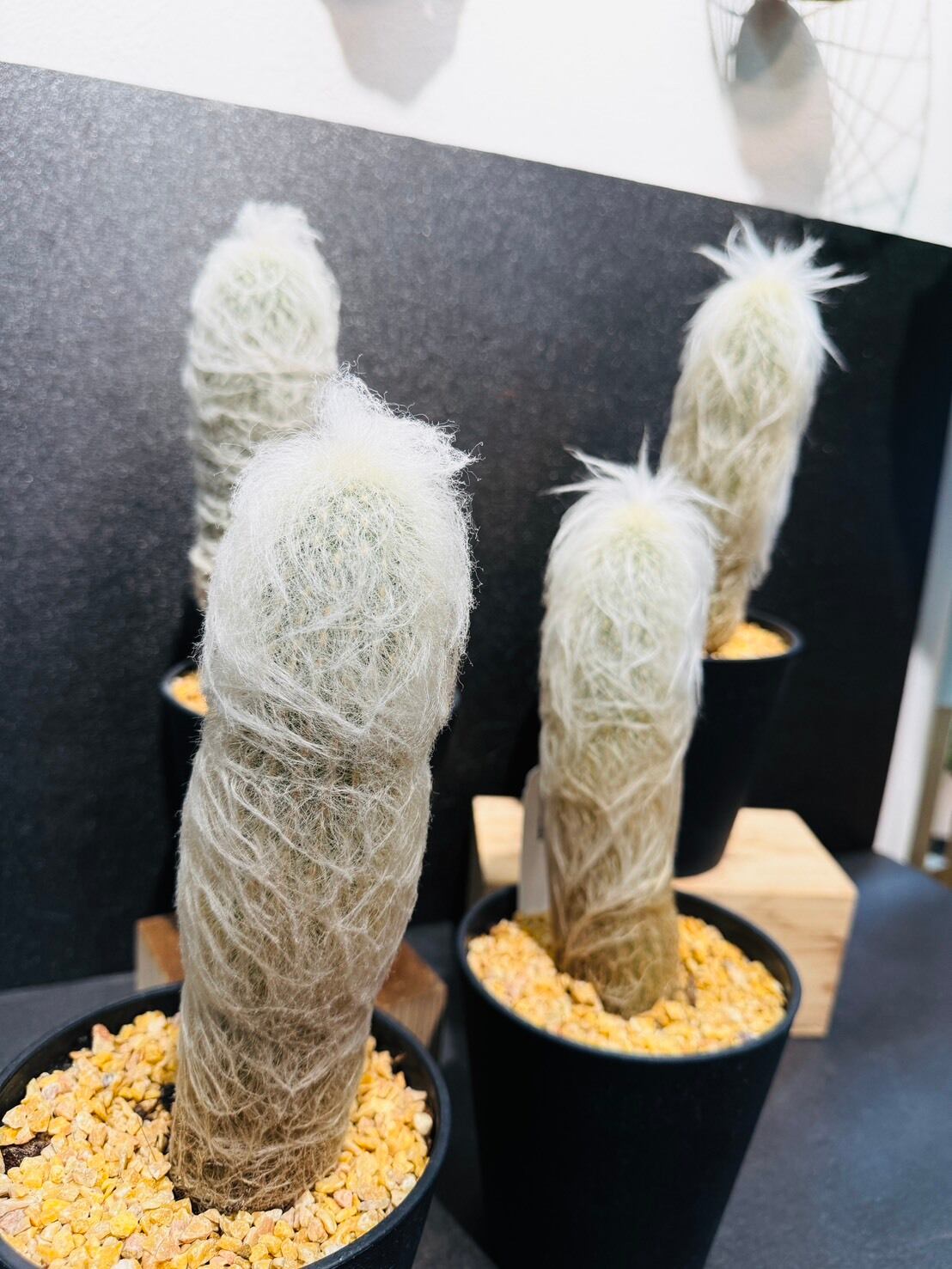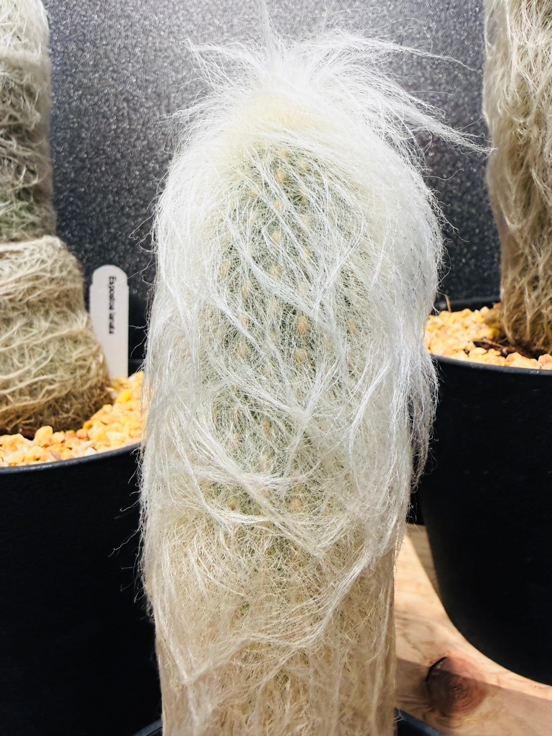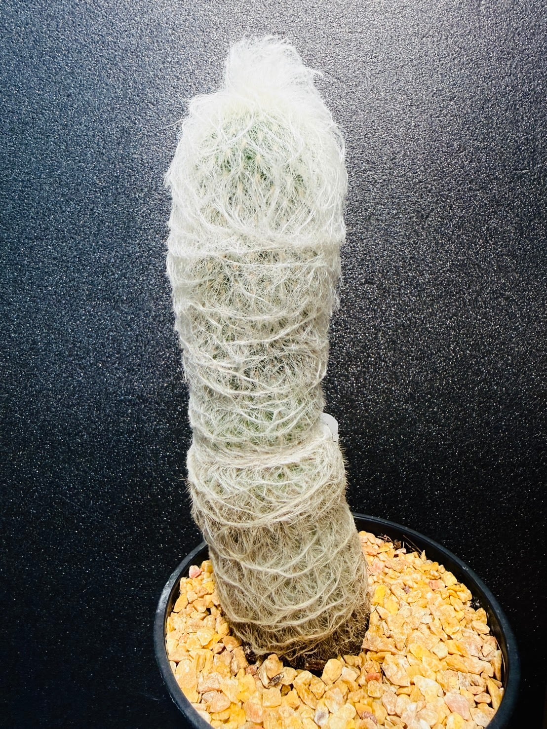 柱サボテン「老楽(おいらく)」(学名:Espostoa lanata)は、サボテン科エスポストア属に分類される、白くモジャモジャした毛が特徴の代表的な「毛柱サボテン」です。