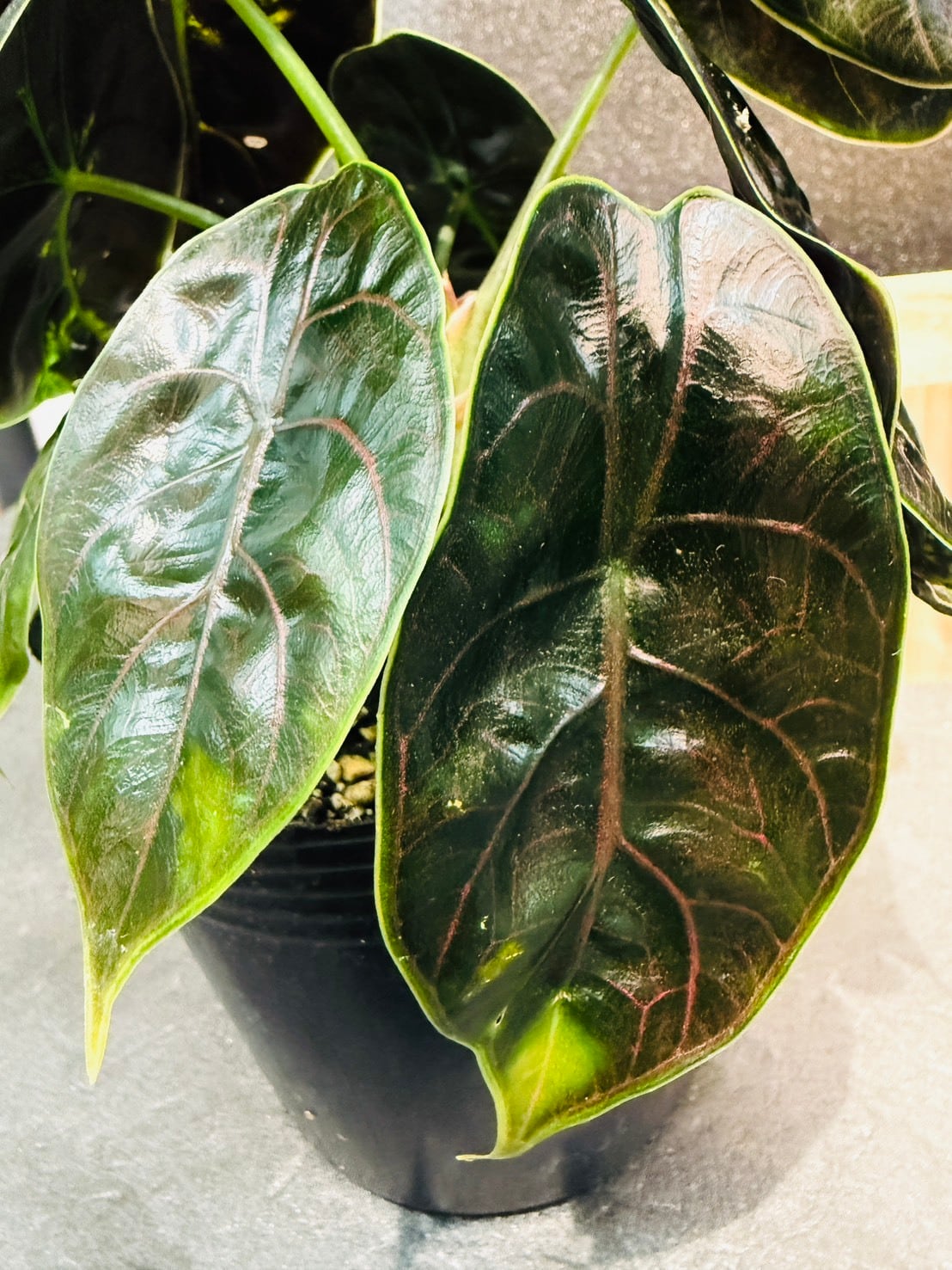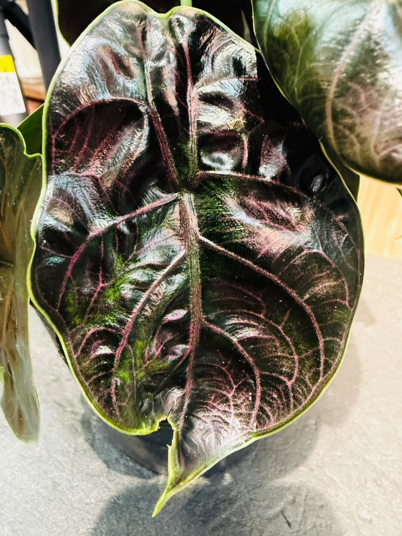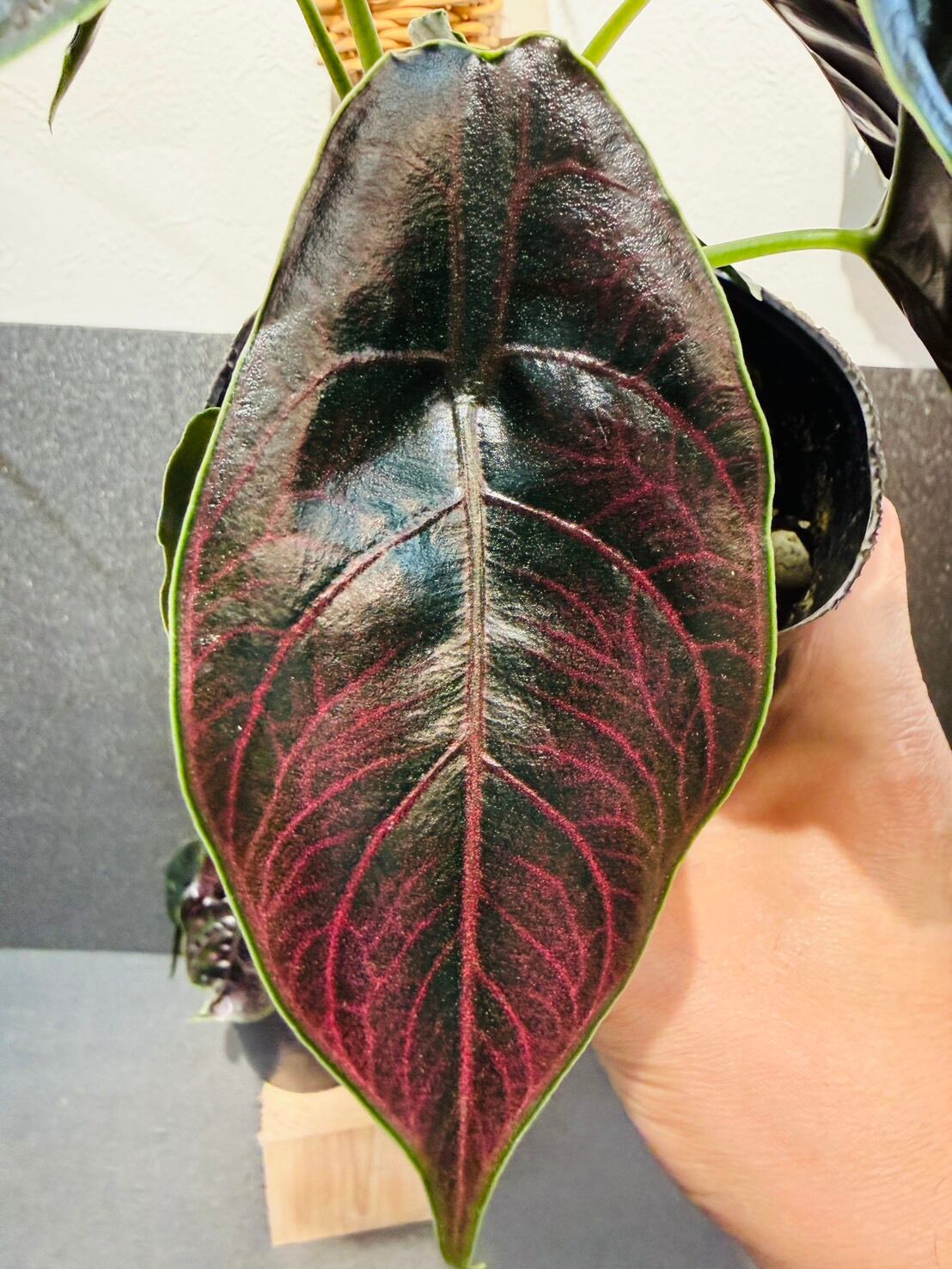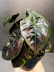 アロカシア・アズラニーは、ジュエリーを想像させるような美しい葉の色にあり、葉は滑らかで光沢があるため、光が当たり反射すると輝いているようにも見えます。