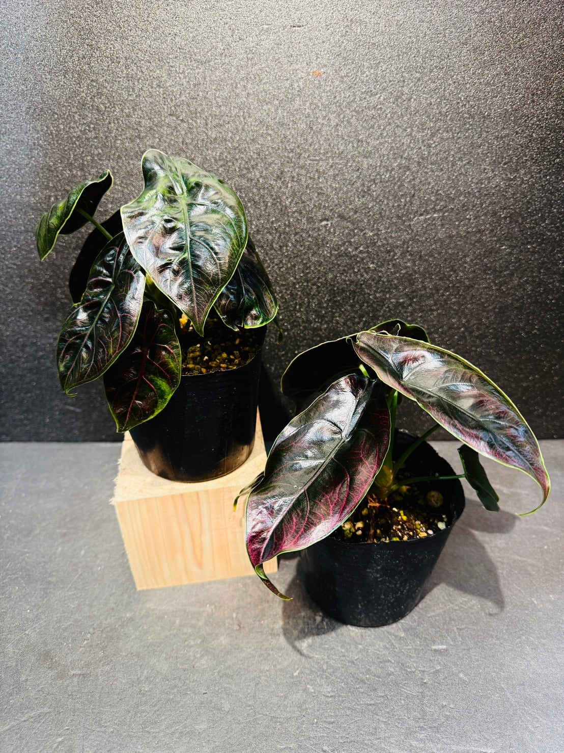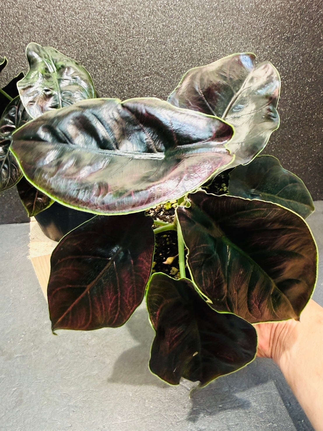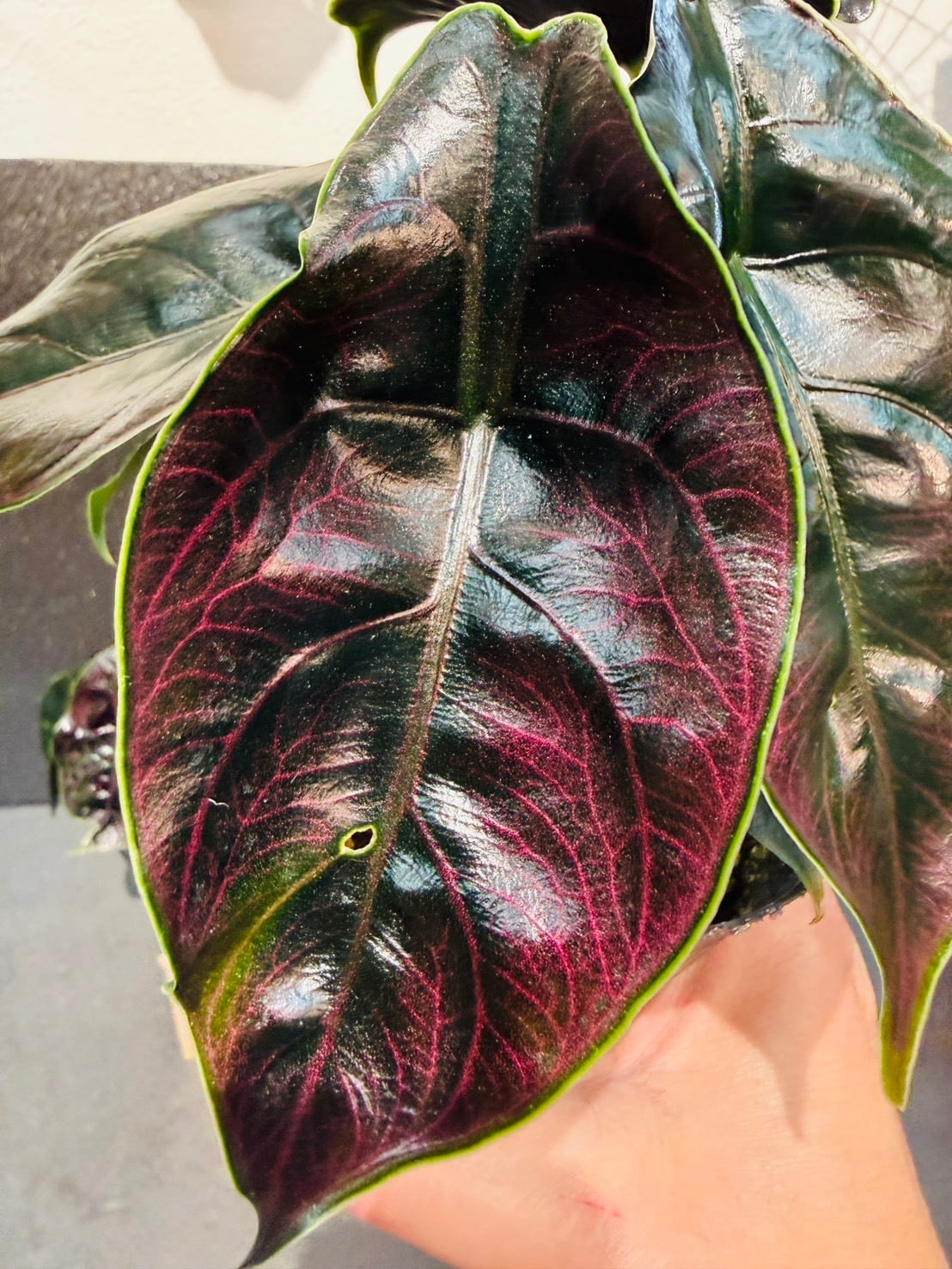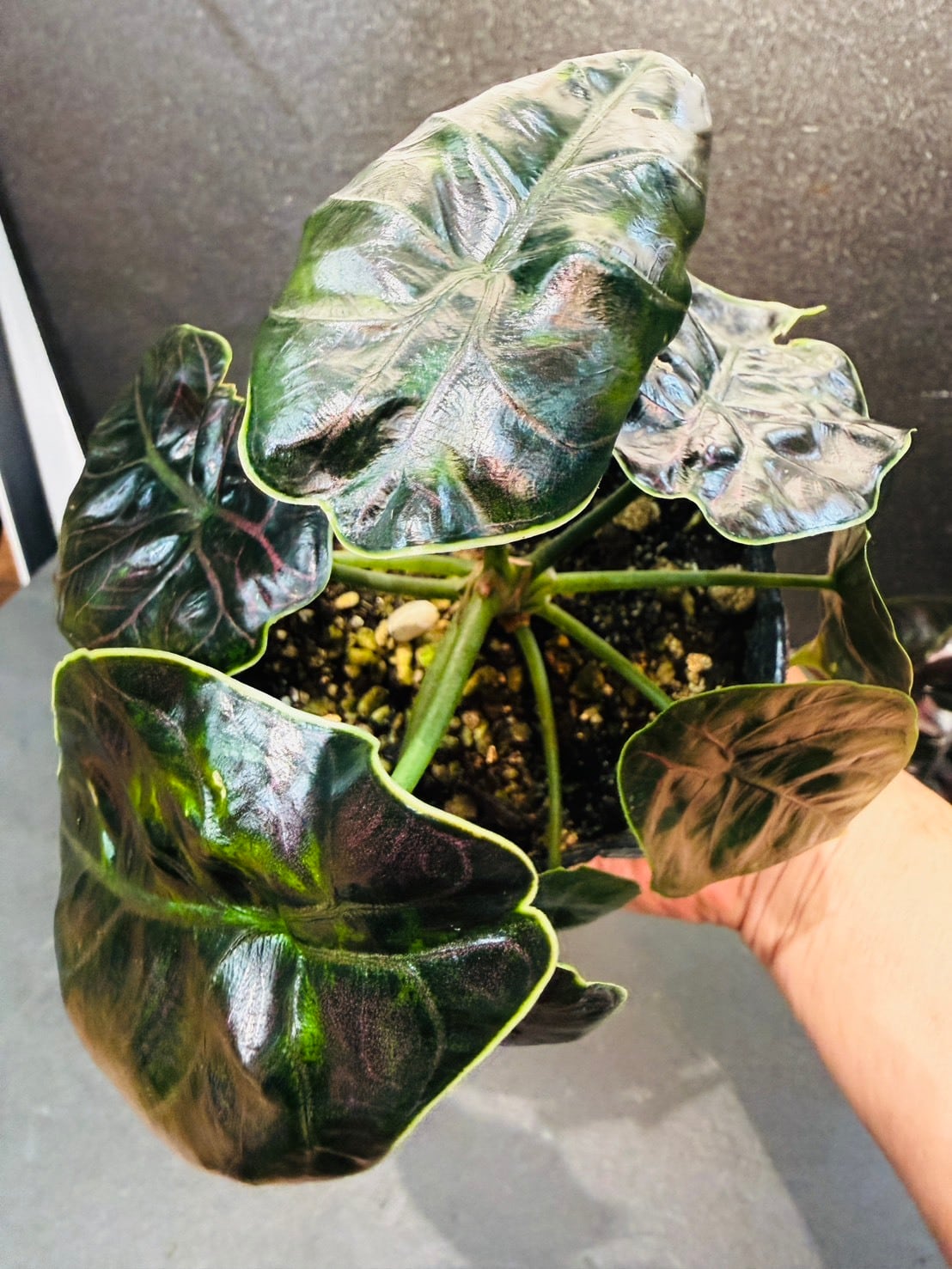アロカシア・アズラニーは、ジュエリーを想像させるような美しい葉の色にあり、葉は滑らかで光沢があるため、光が当たり反射すると輝いているようにも見えます。