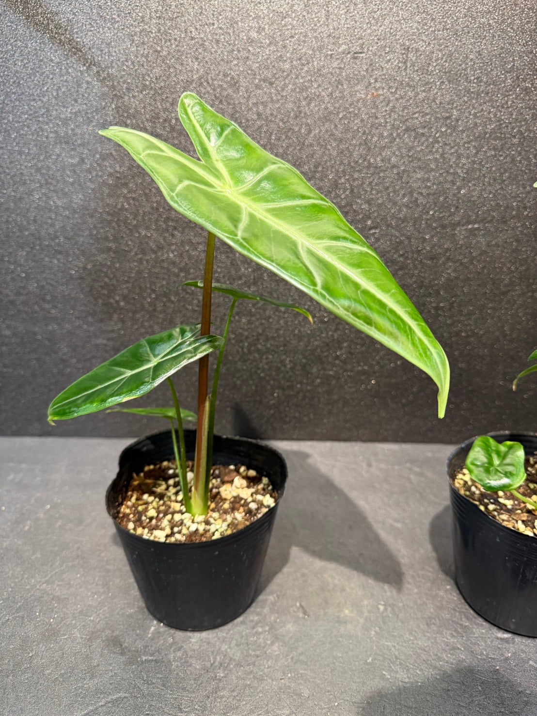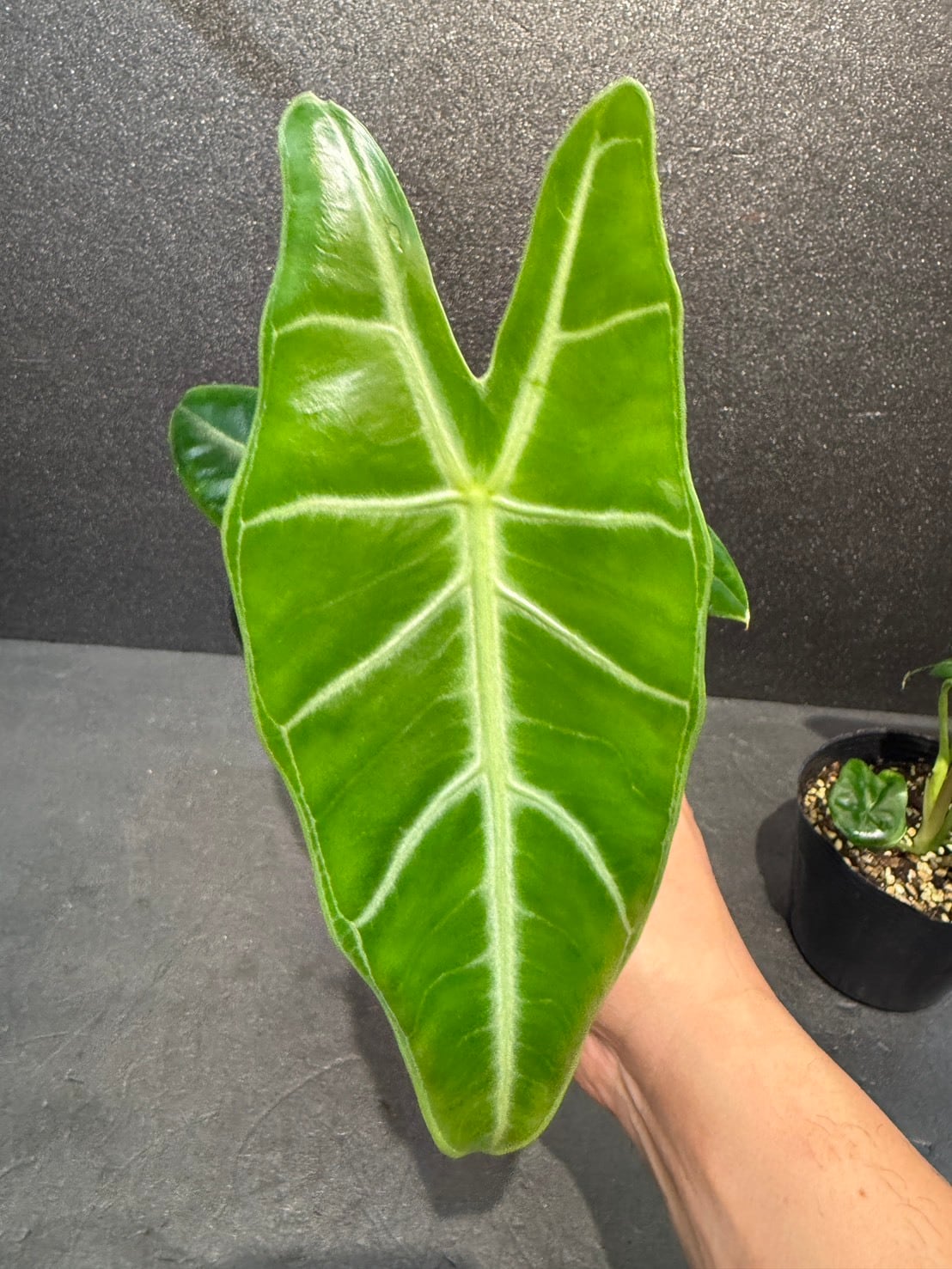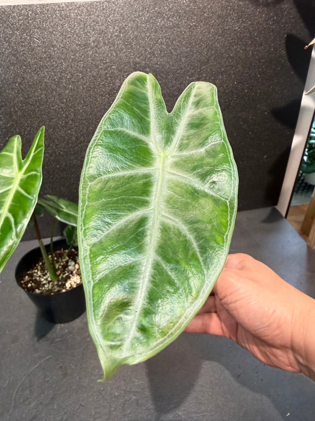 アロカシア・ロンギロバは、東南アジア原産のサトイモ科植物で、細長い矢じり型の葉と、濃緑色に映える美しいシルバーの葉脈が特徴のエキゾチックな観葉植物です。