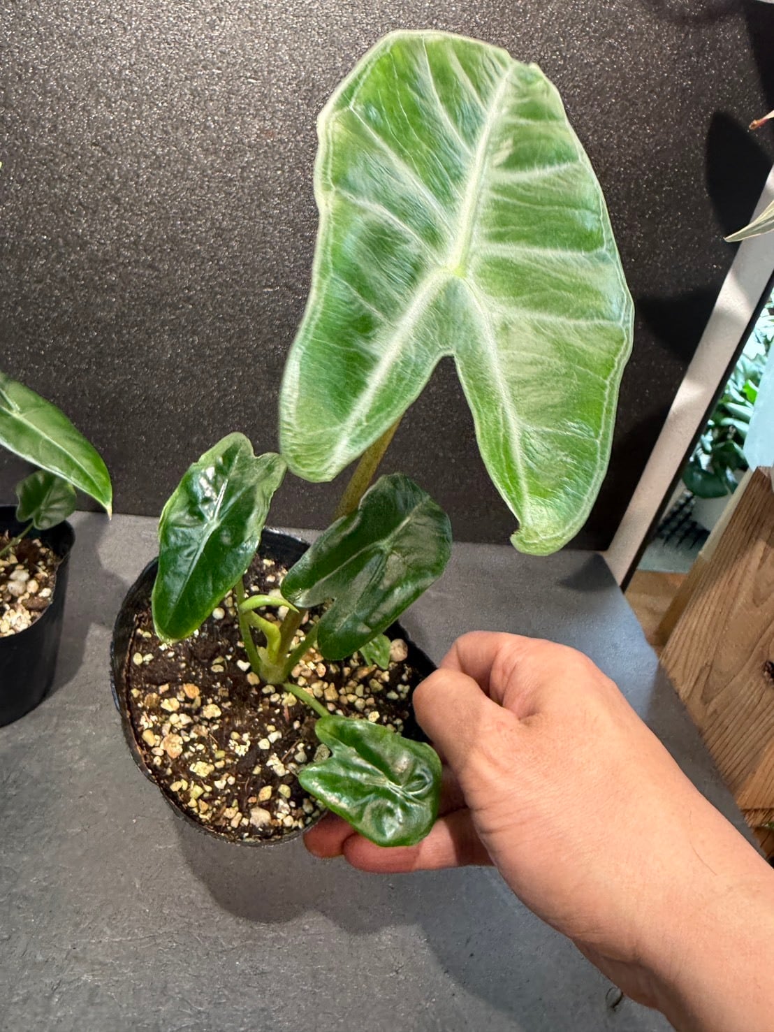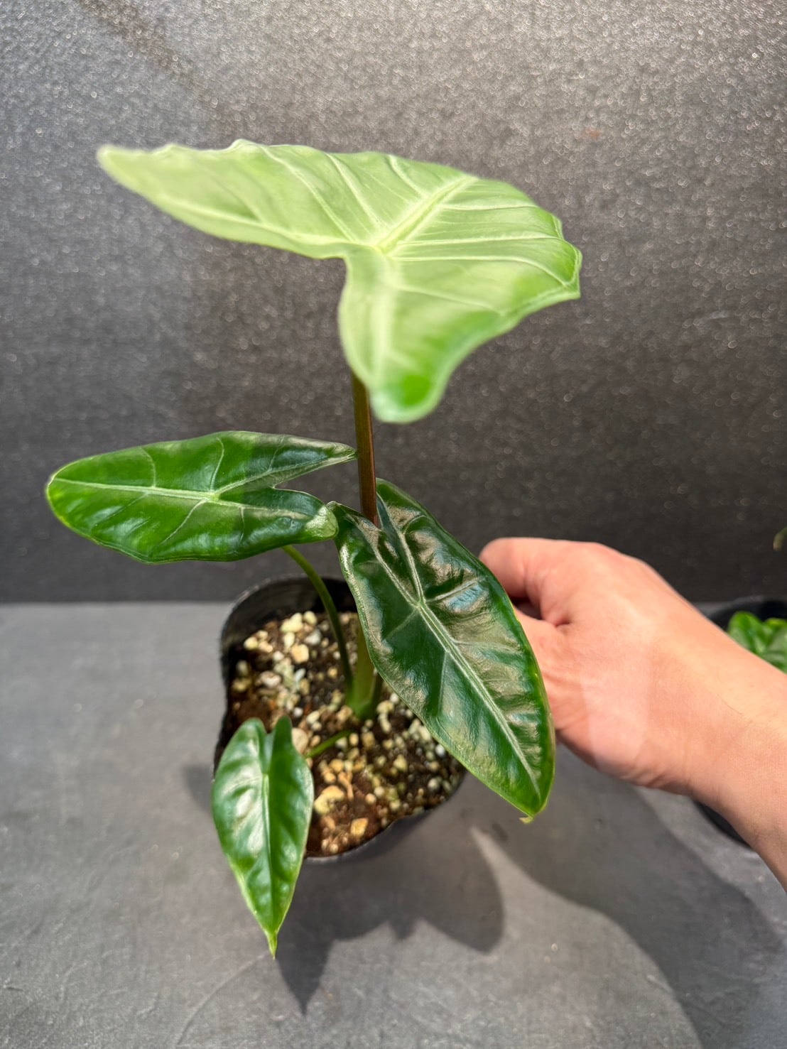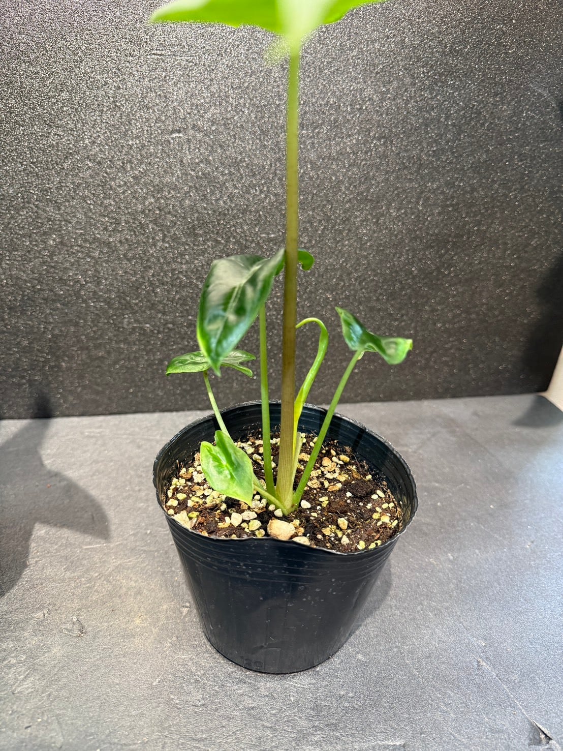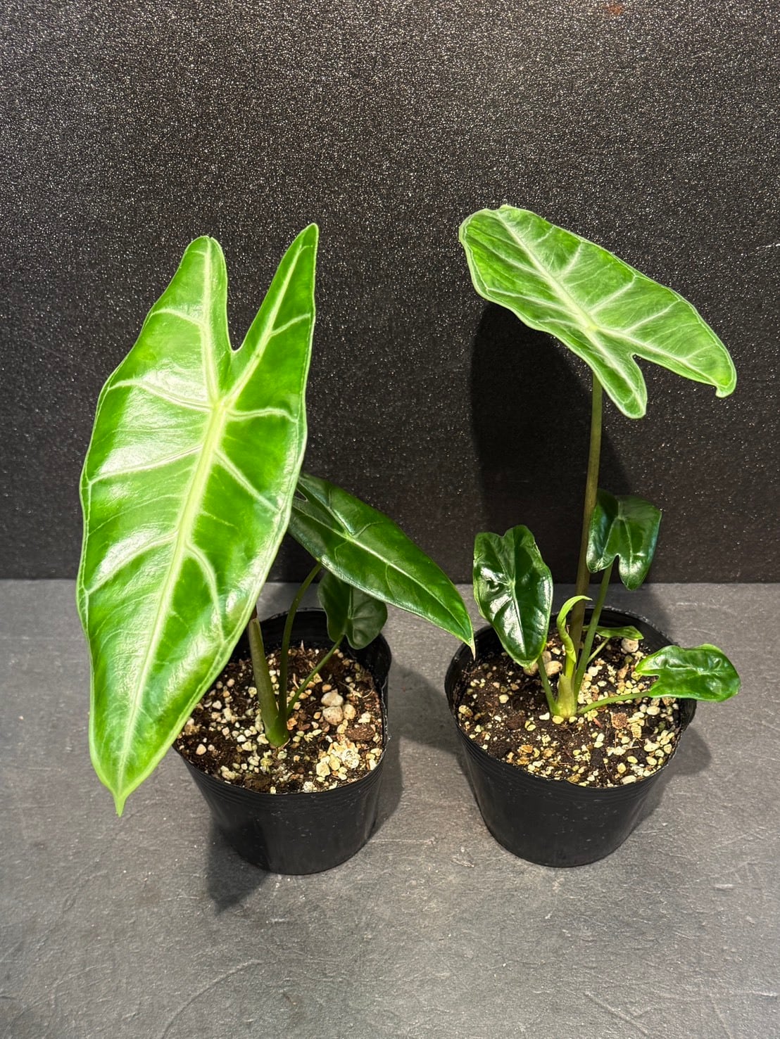アロカシア・ロンギロバは、東南アジア原産のサトイモ科植物で、細長い矢じり型の葉と、濃緑色に映える美しいシルバーの葉脈が特徴のエキゾチックな観葉植物です。