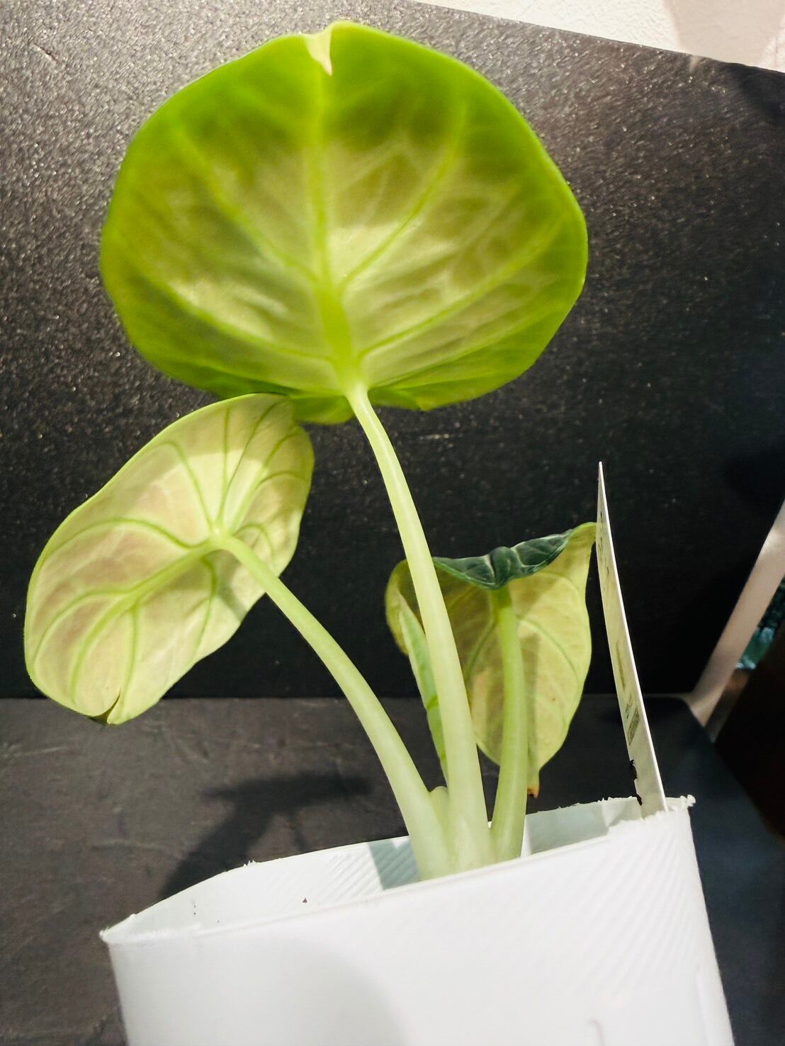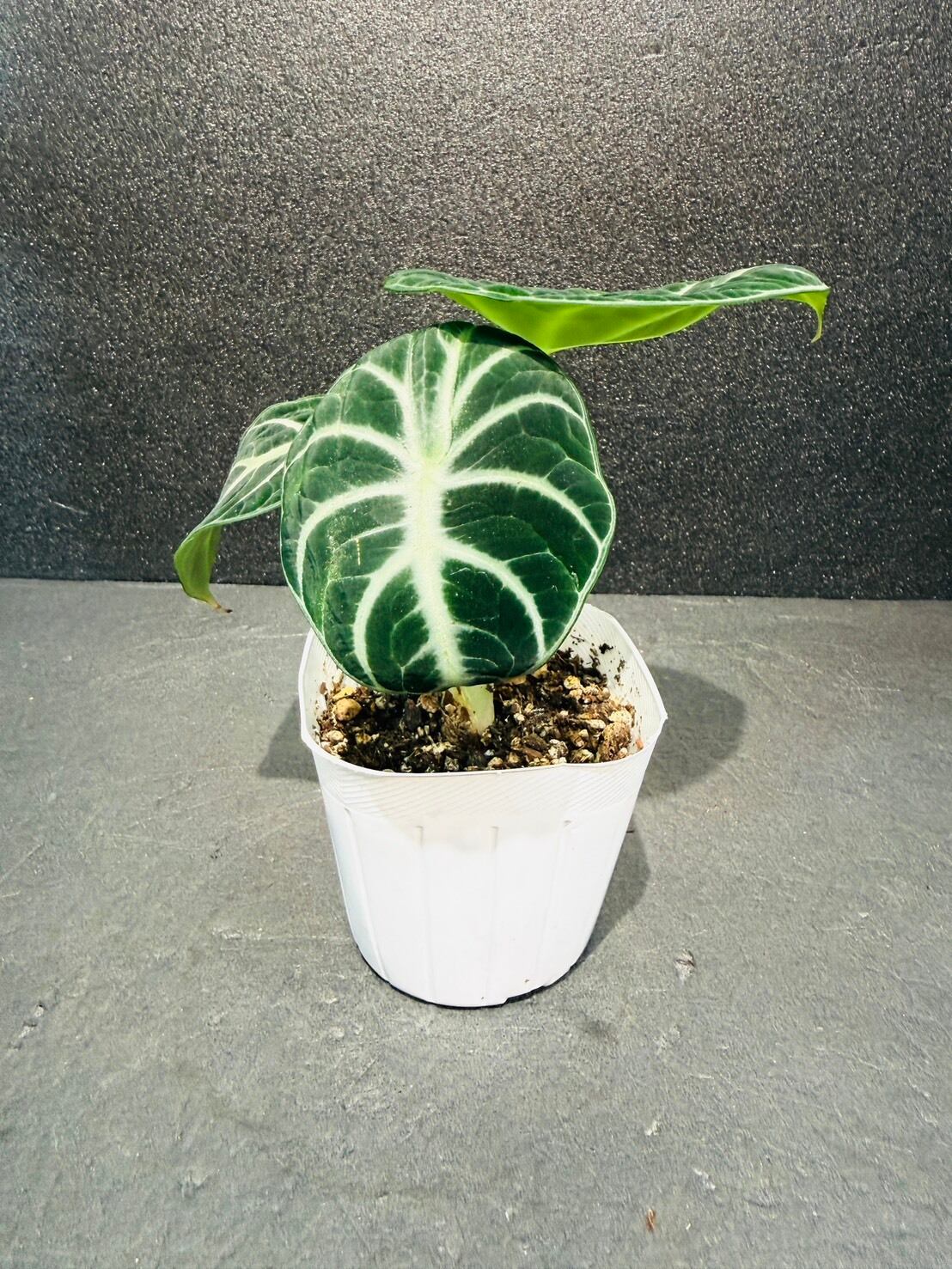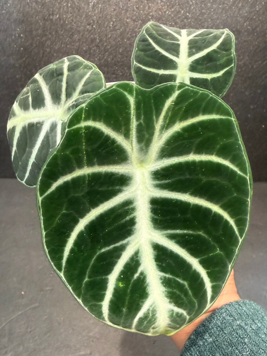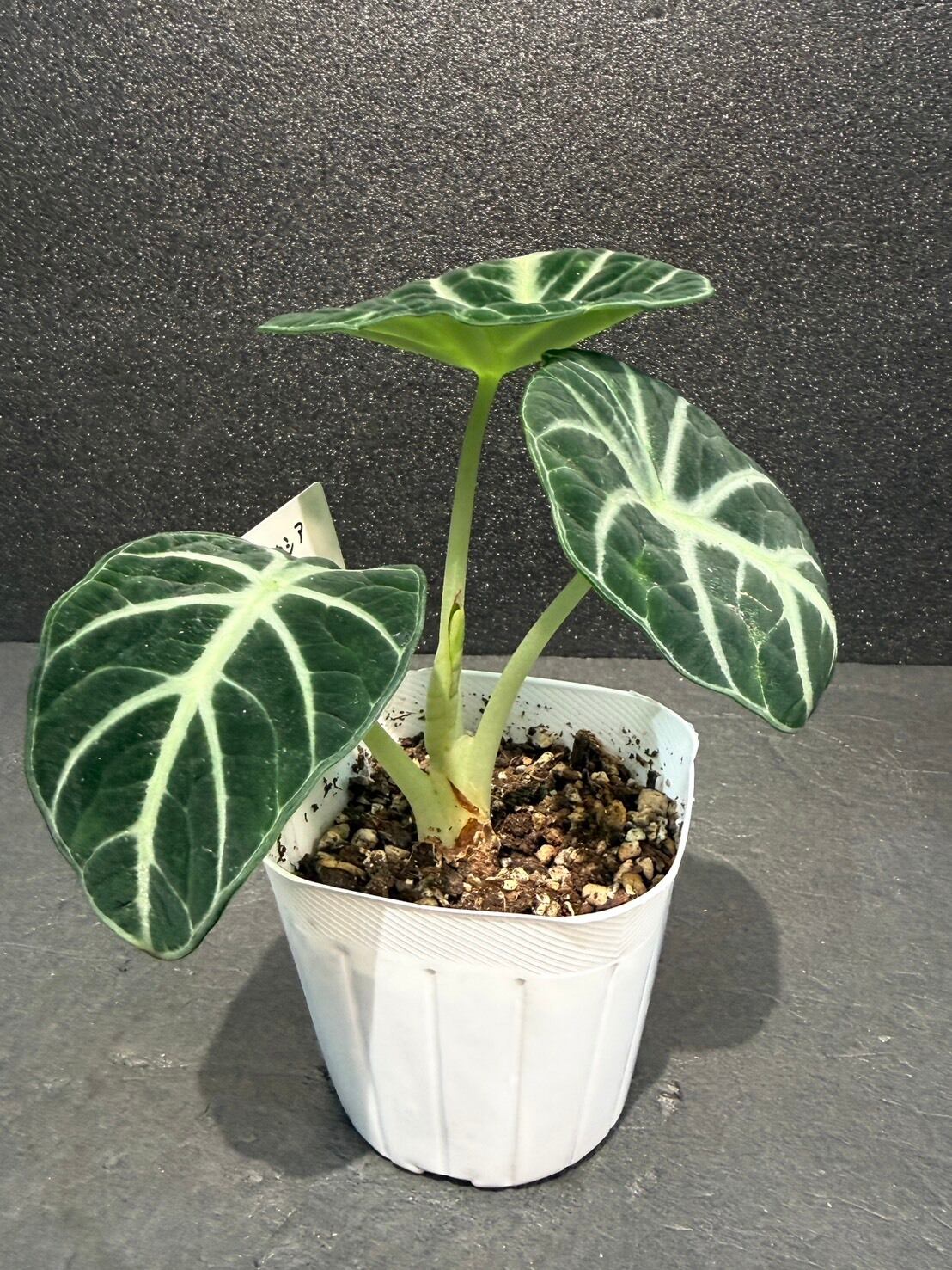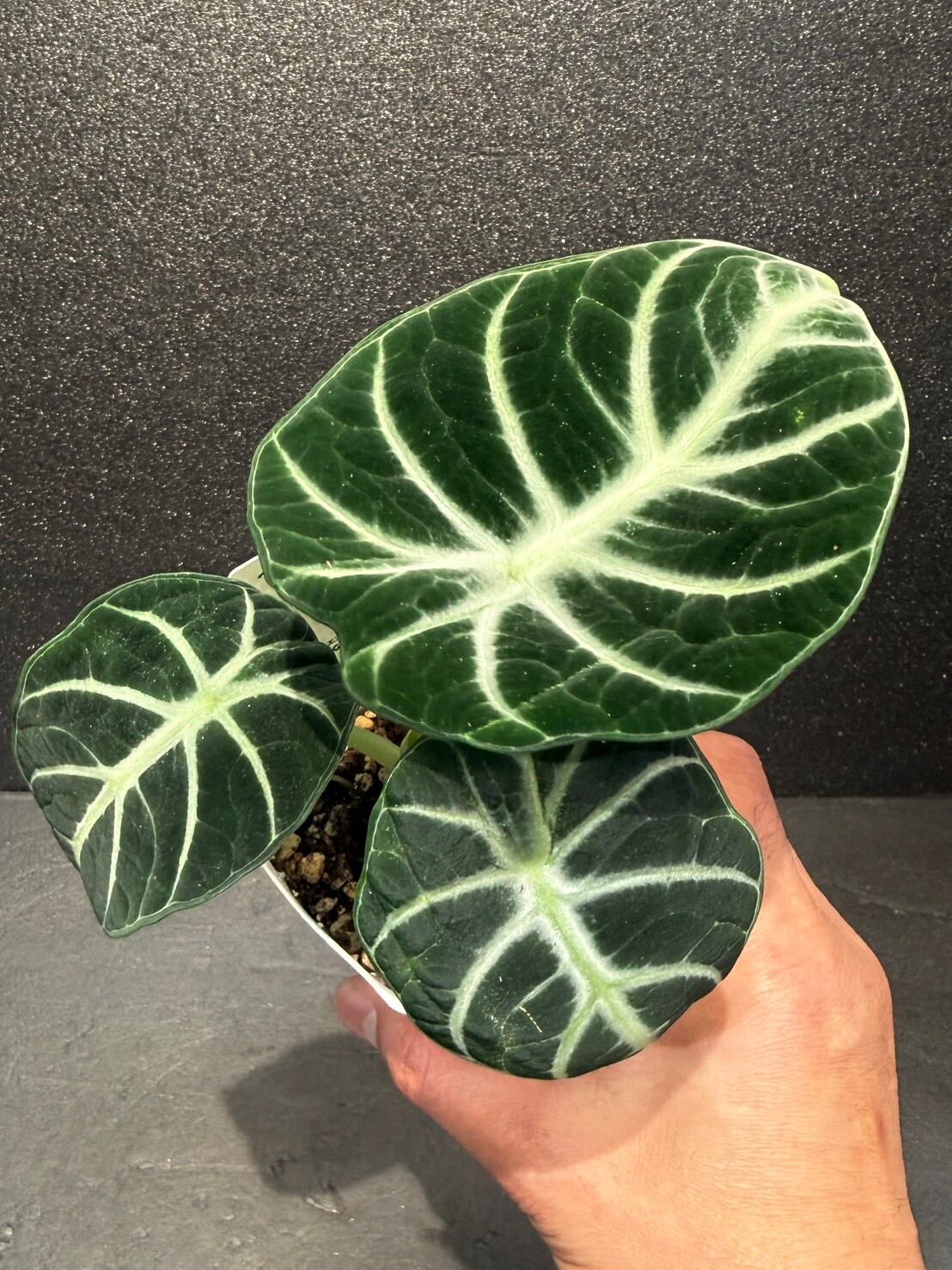 アロカシア・ニンジャは、黒に近いダークグリーンのベルベット状の葉に、くっきりとした銀白色の葉脈が映える、丸みを帯びた卵型の葉を持つ小型のサトイモ科の観葉植物です。