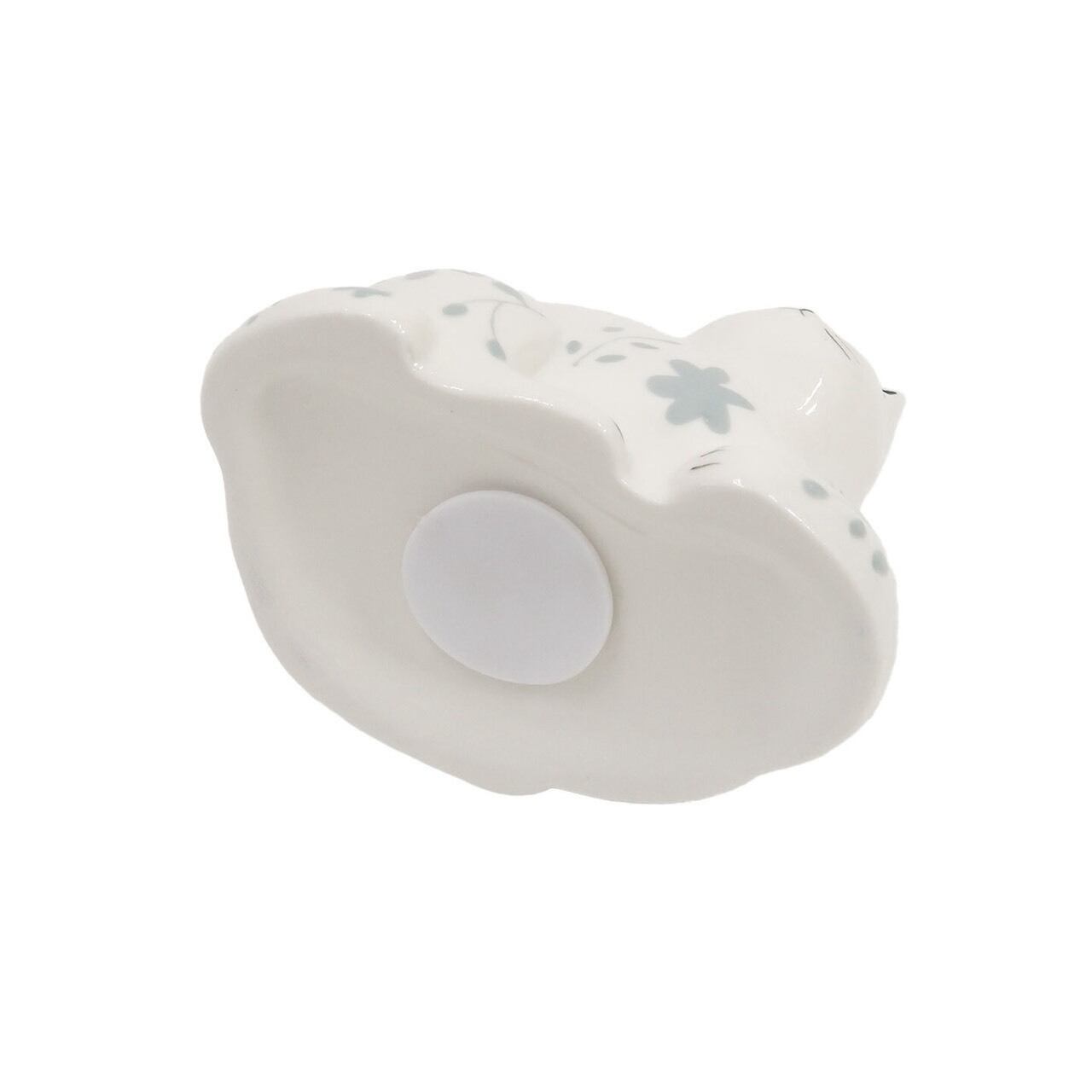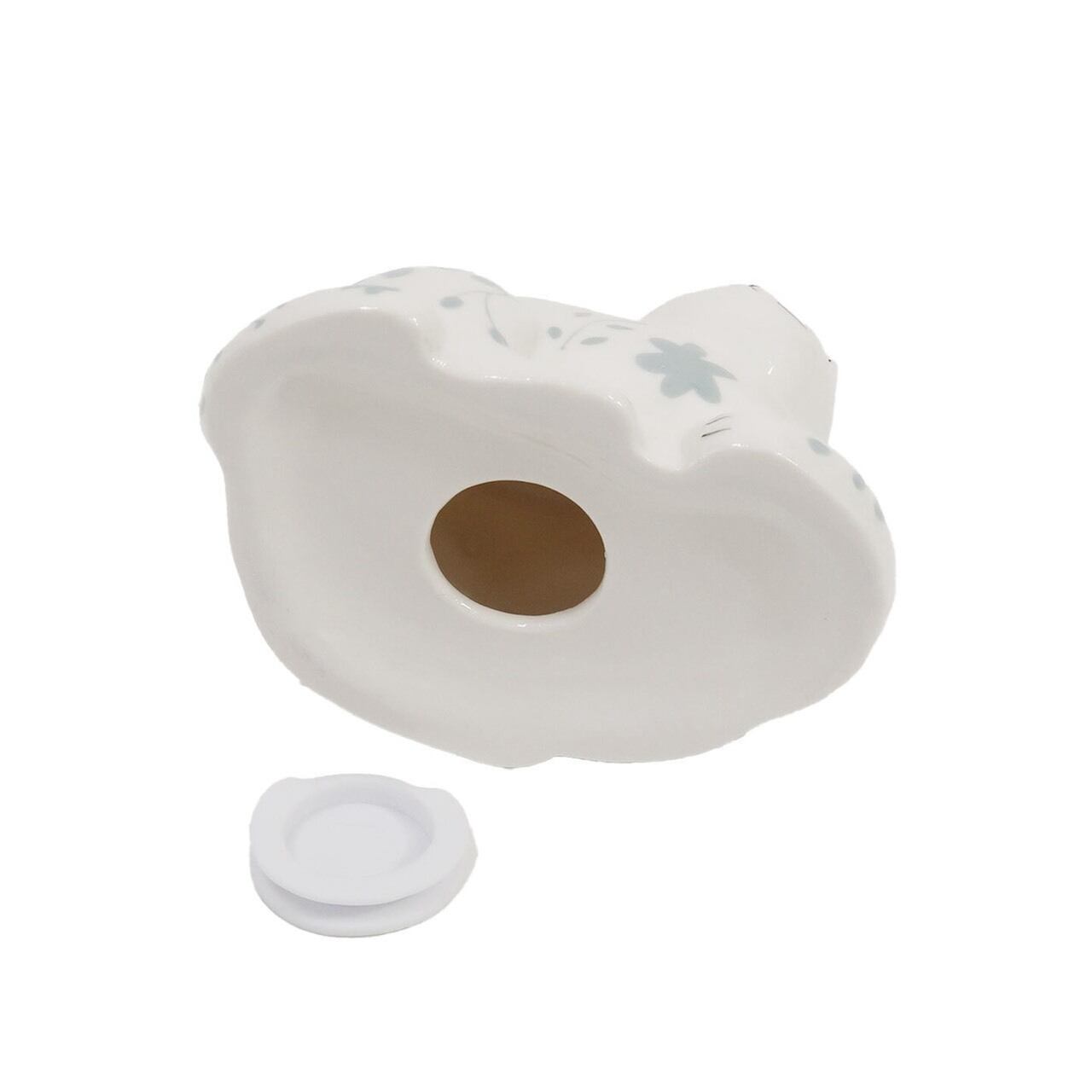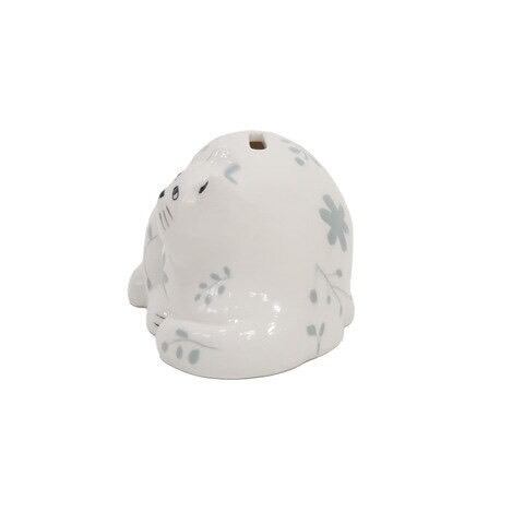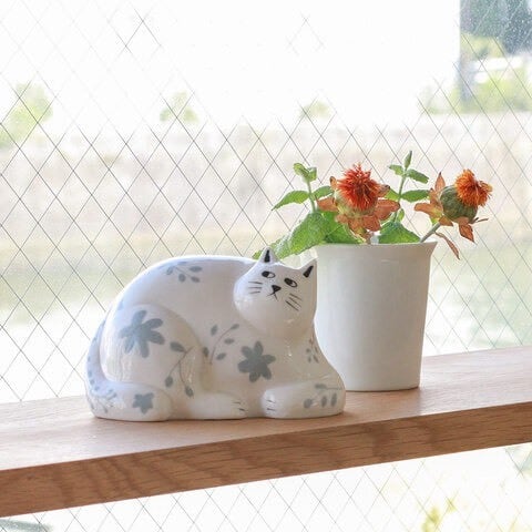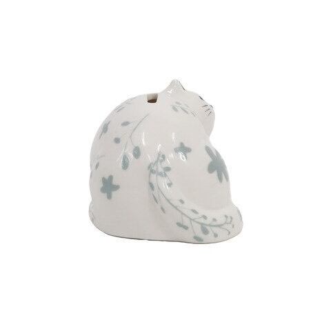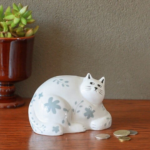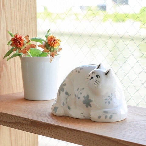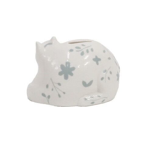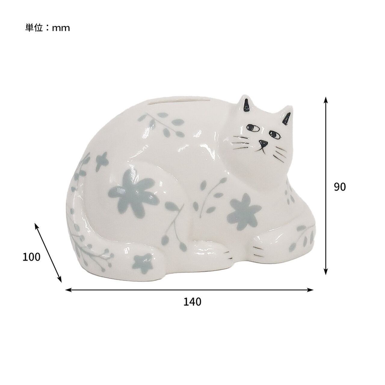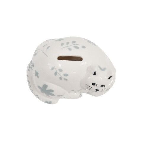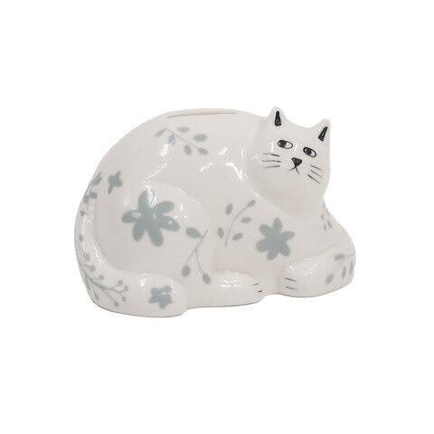 愛らしい花柄をまとった磁器製の猫の貯金箱です。