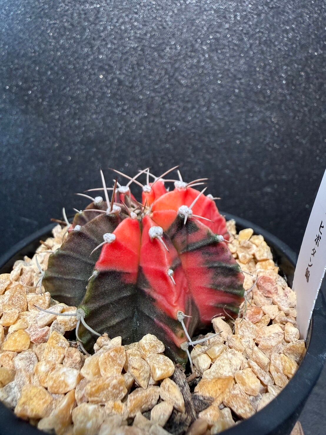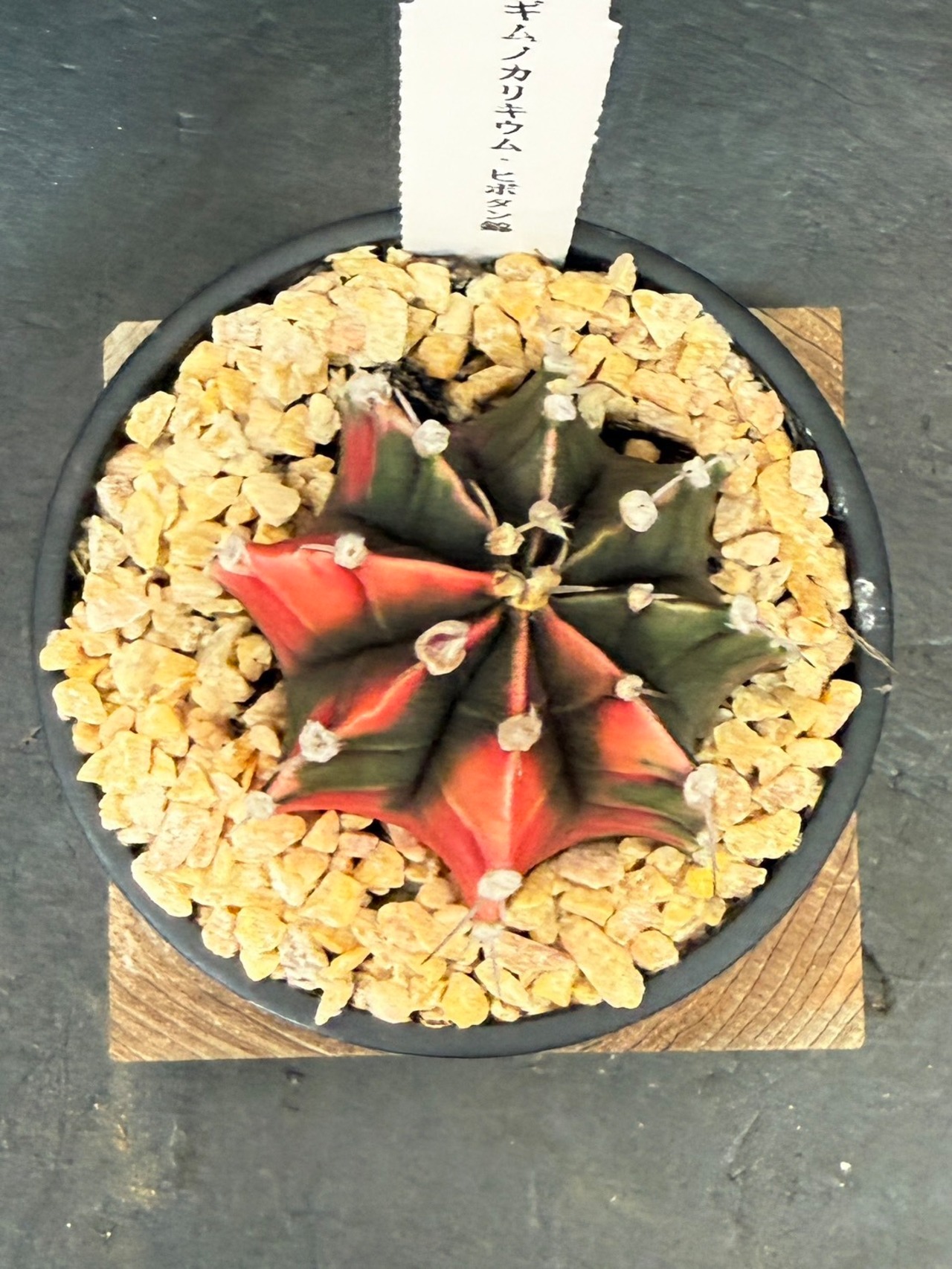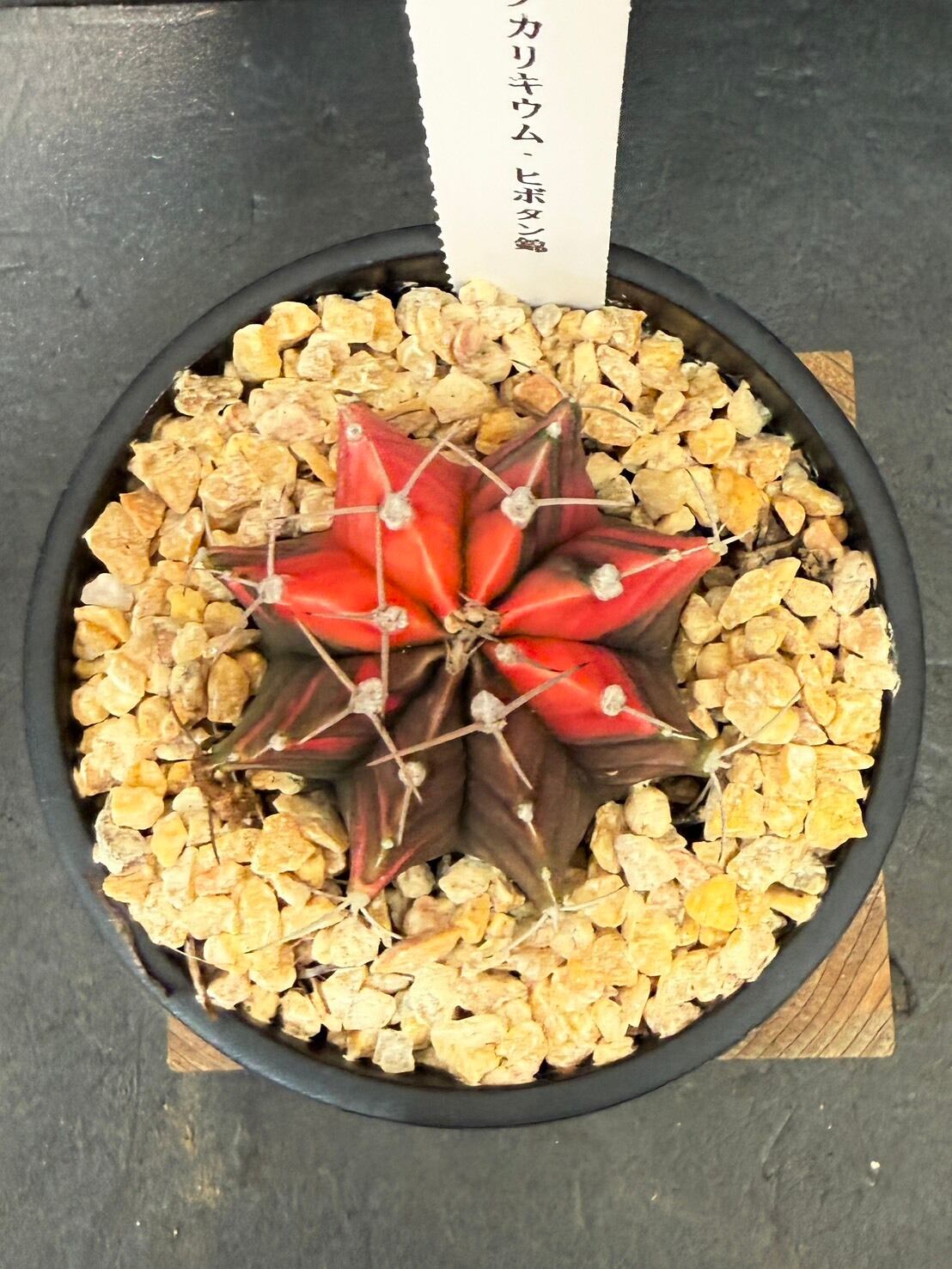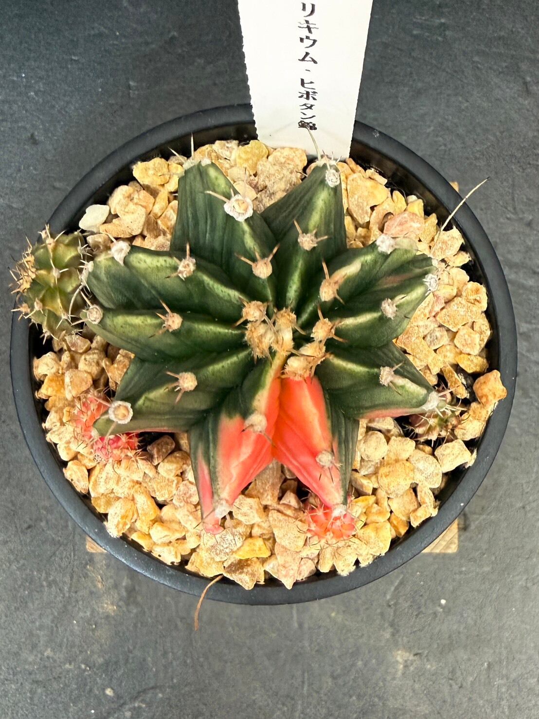 三角柱に接ぎ木されている緋牡丹は、この緋牡丹錦の斑が広がり全体が赤くなった種となります。