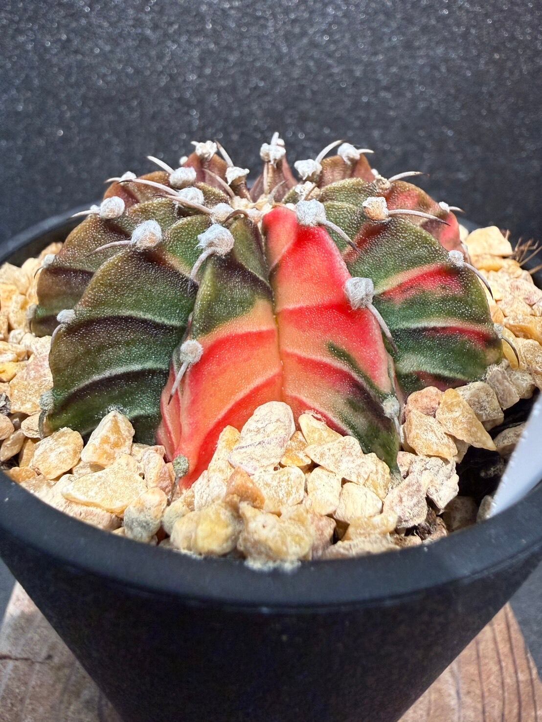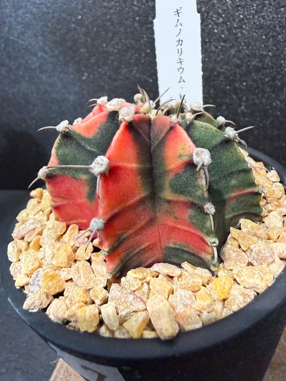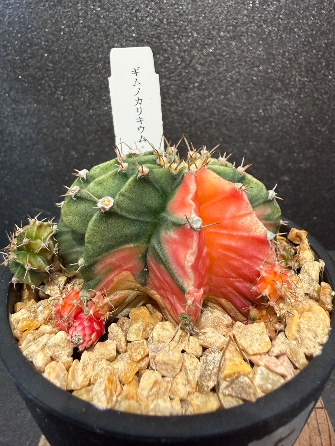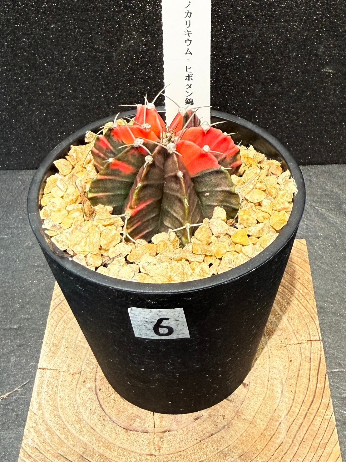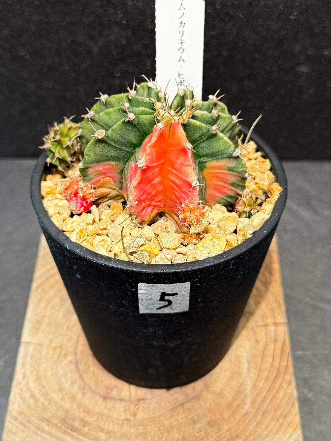 三角柱に接ぎ木されている緋牡丹は、この緋牡丹錦の斑が広がり全体が赤くなった種となります。