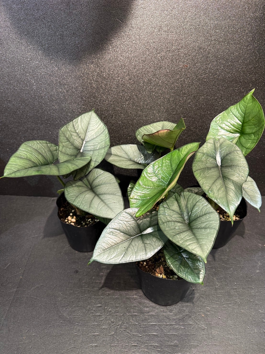 アロカシア・レギネ(Alocasia reginae)は、ボルネオ原産の美しい観葉植物で、ベルベットのような質感の濃緑色の葉と、裏側のコントラストが特徴的な品種です。