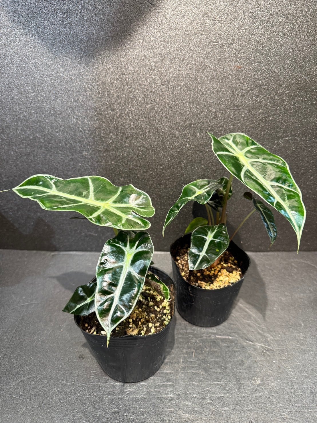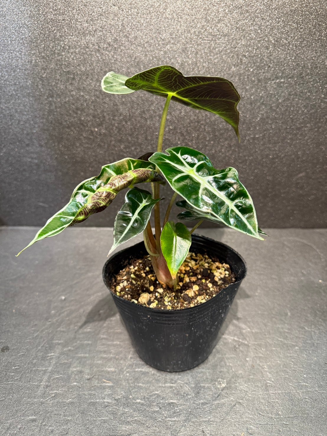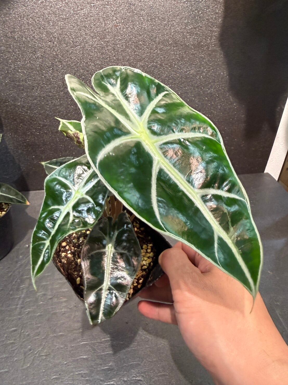 アロカシア・ポリー(Alocasia 'Polly')は、濃緑色の光沢がある葉に白い葉脈が特徴です。