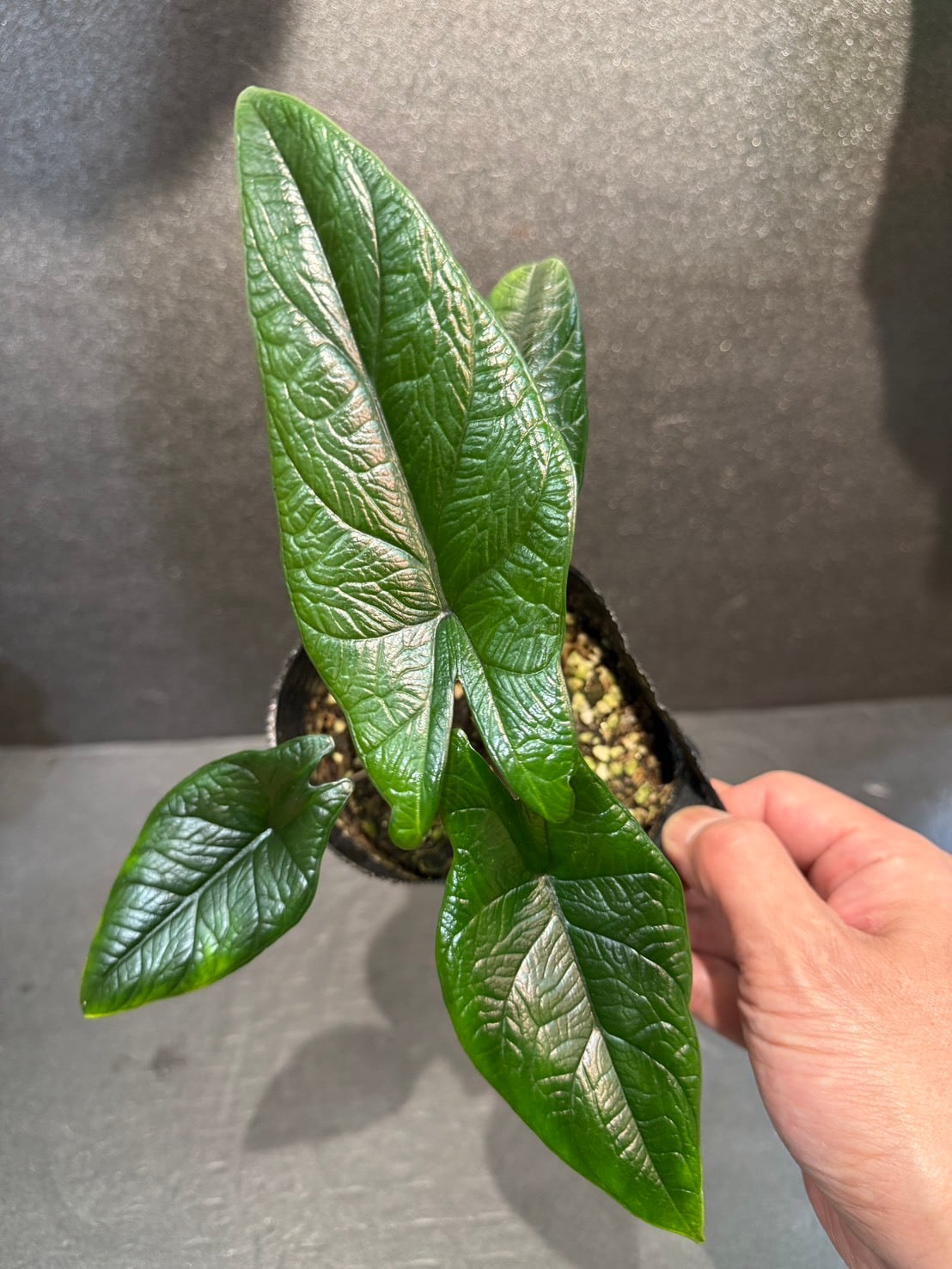 アロカシア・スカルプラムは、フィリピン原産のサトイモ科の観葉植物で、矢じり型で濃い緑色の葉に浮き出た葉脈が特徴です。