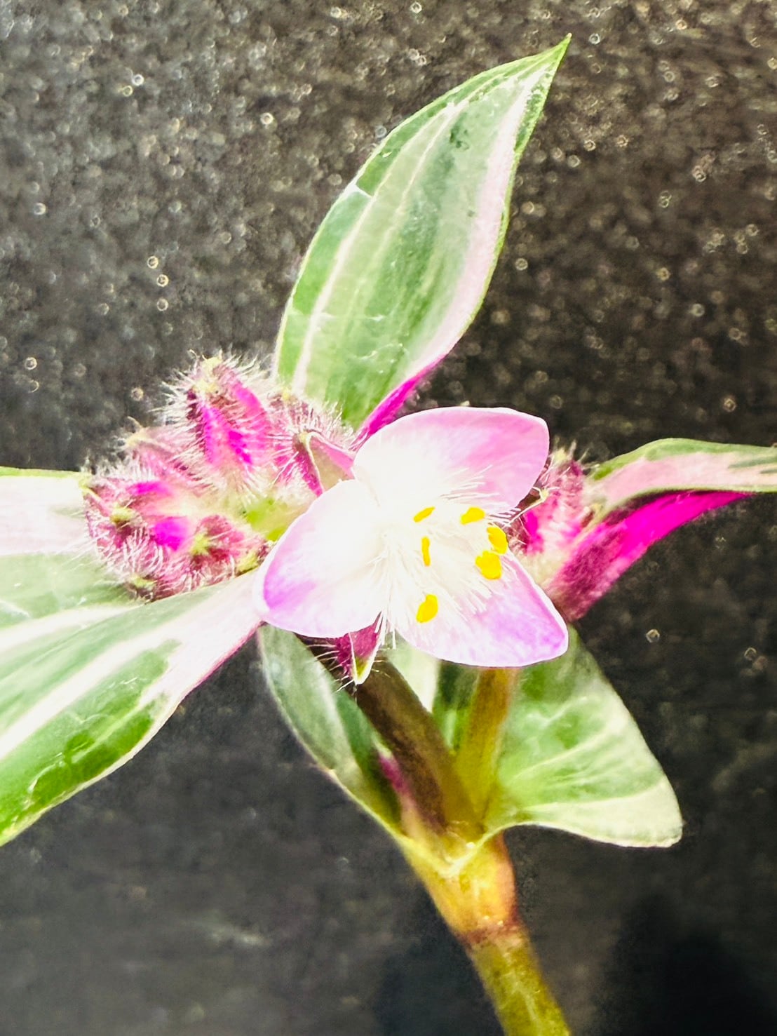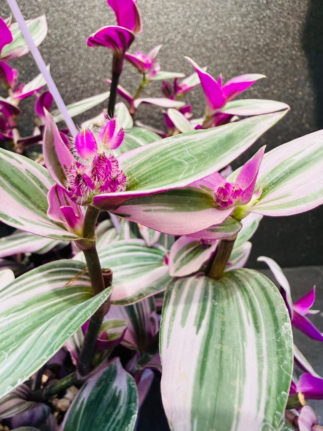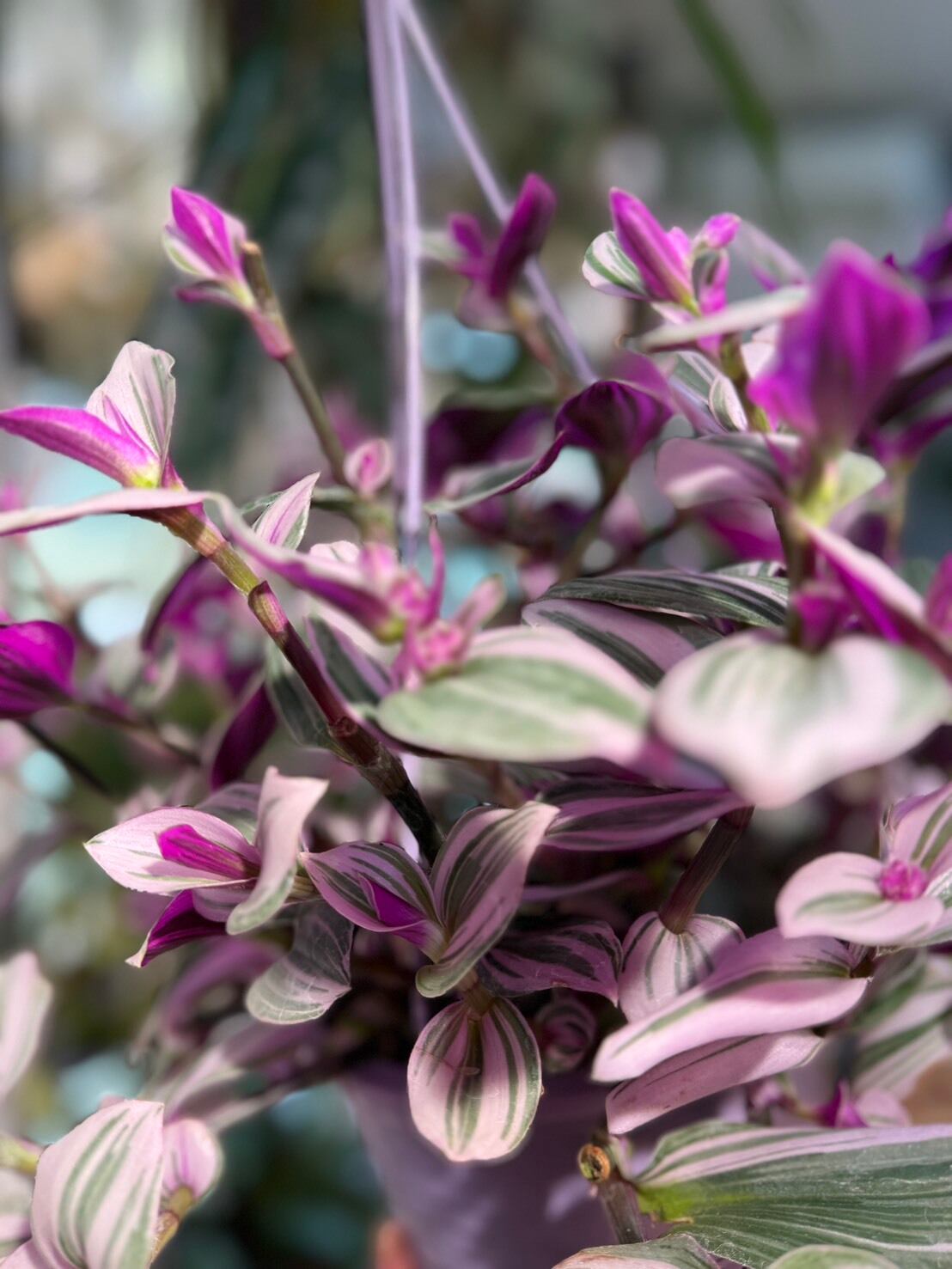 トラディスカンティア・ナヌークは、ピンク、緑、白のストライプが入った厚みのある多肉質な葉と、裏面の鮮やかなパープルとの対比が美しいツユクサ科の観葉植物です。
