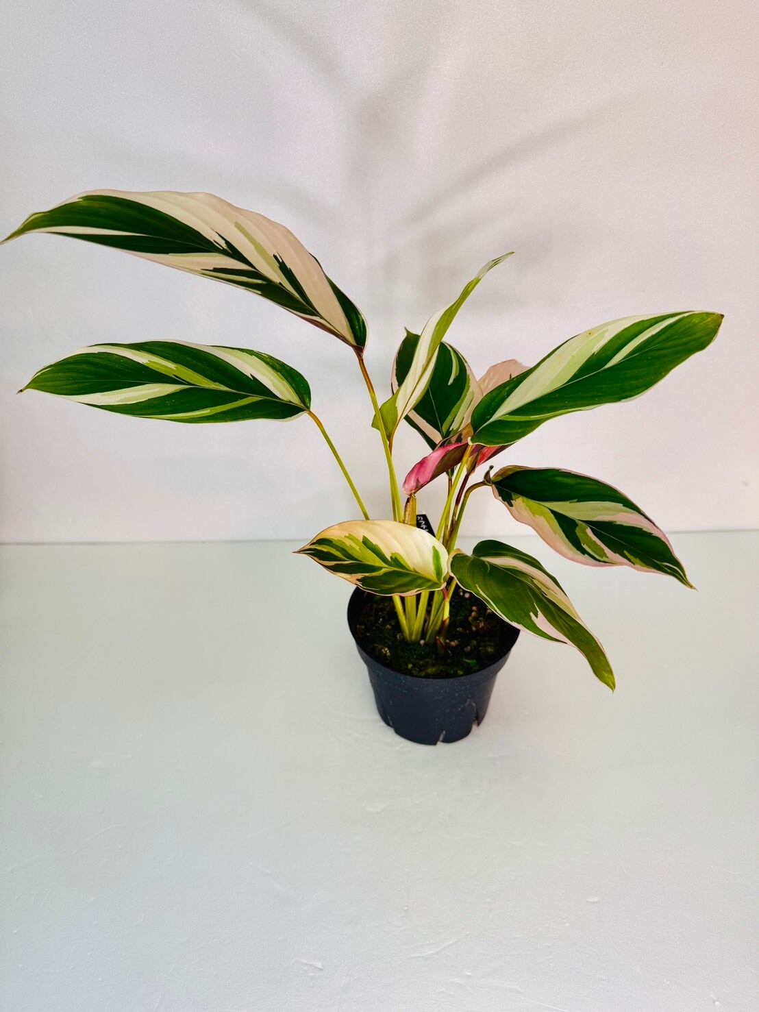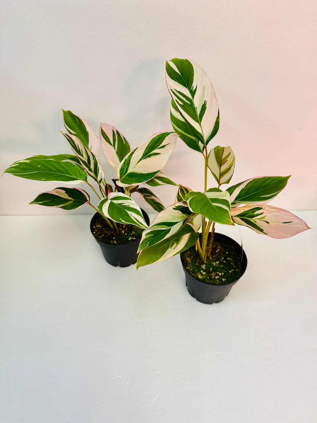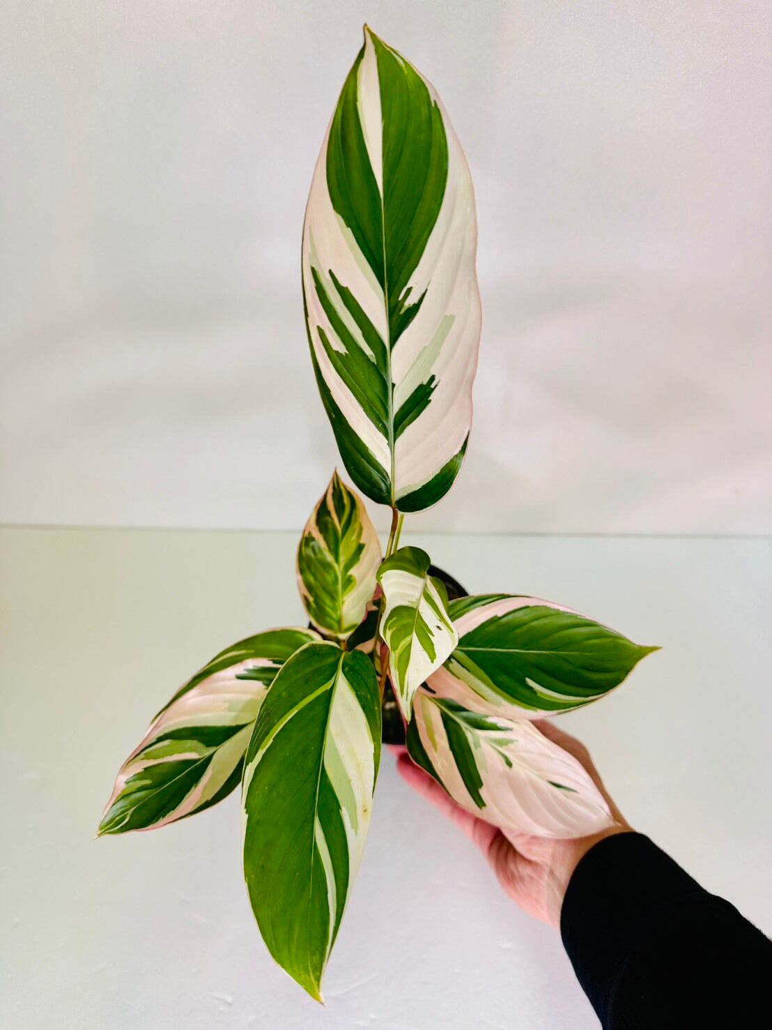 カラテア・ウォーターカラー(Calathea Watercolor)は、白とグリーンのコントラストが水彩画のように繊細で、葉柄にほんのりピンクが混ざる非常に美しい熱帯観葉植物です。