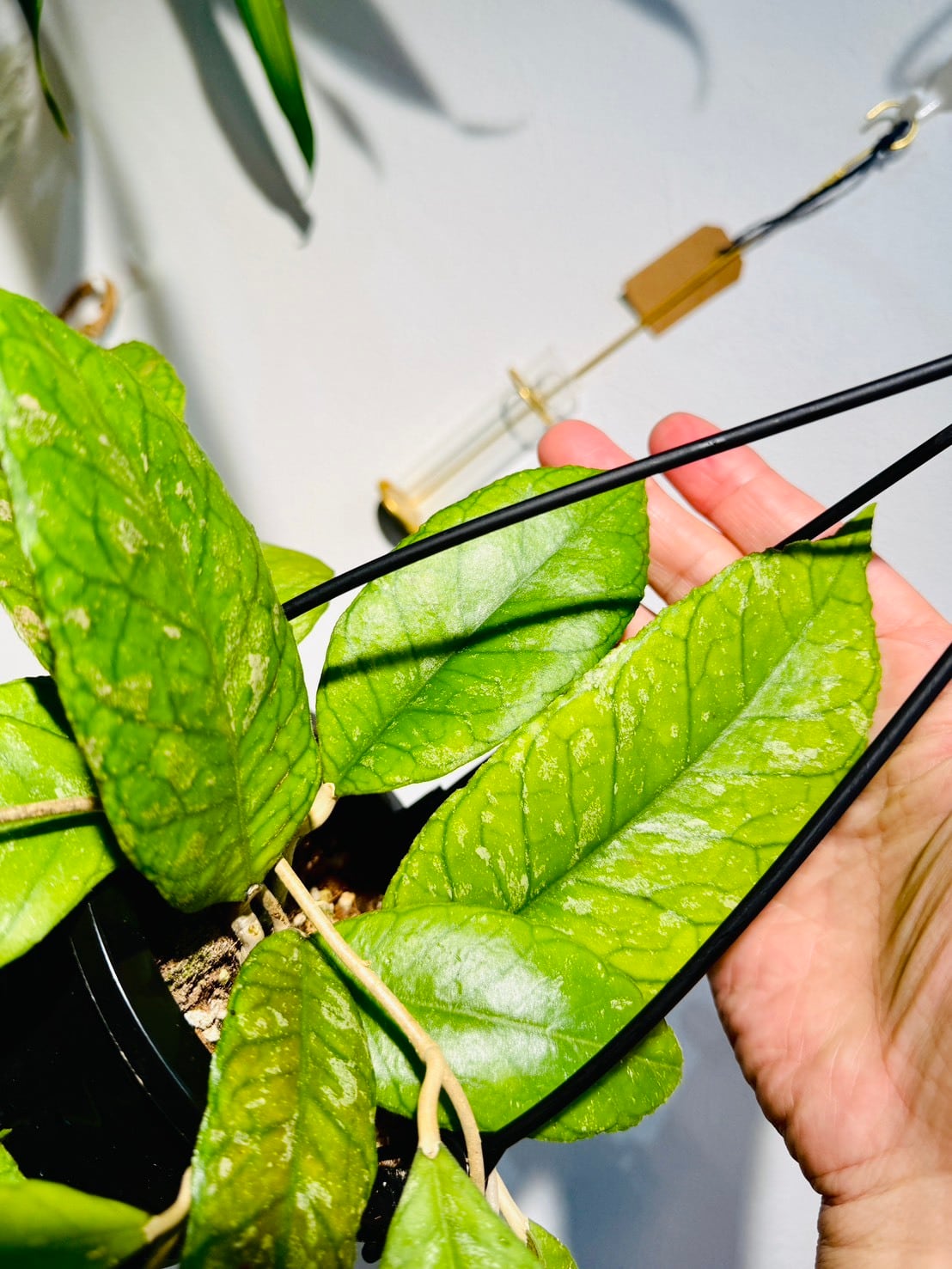 ホヤ・バホイスプラッシュは、葉の表面にまるでペンキを飛び散らせたような銀白色やクリーム色の斑点(スプラッシュ)が不規則に入るのが特徴です。