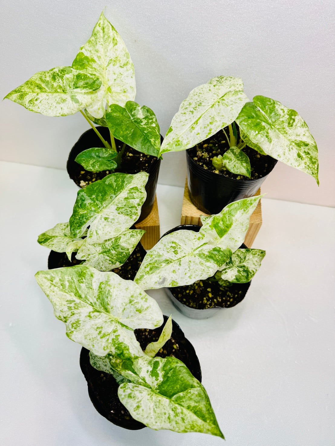 アロカシア・オドラ・バリエガータ・バティックは、深い緑の葉に白やクリーム色の散り斑が「バティック(ろうけつ染め)」のように入る美しい品種です。