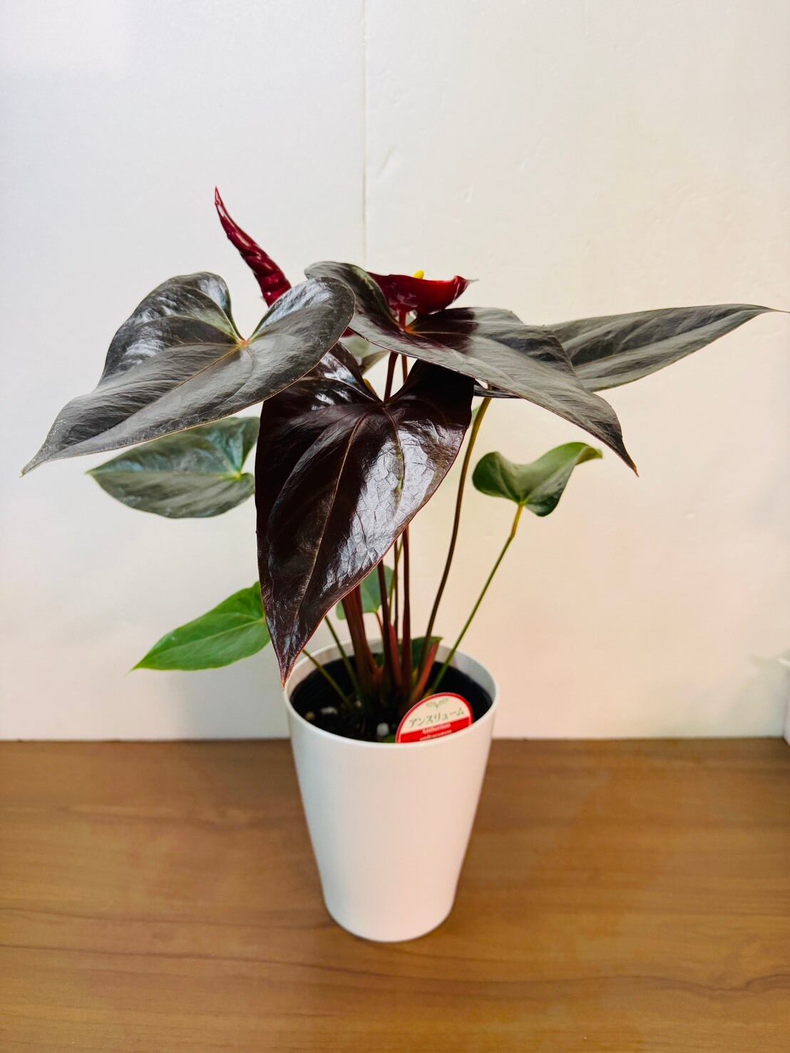 アンスリウム・デリカータは、濃いワインレッド~ダークレッドのシックな仏炎苞と光沢のある深い緑~銅色の葉が特徴です。