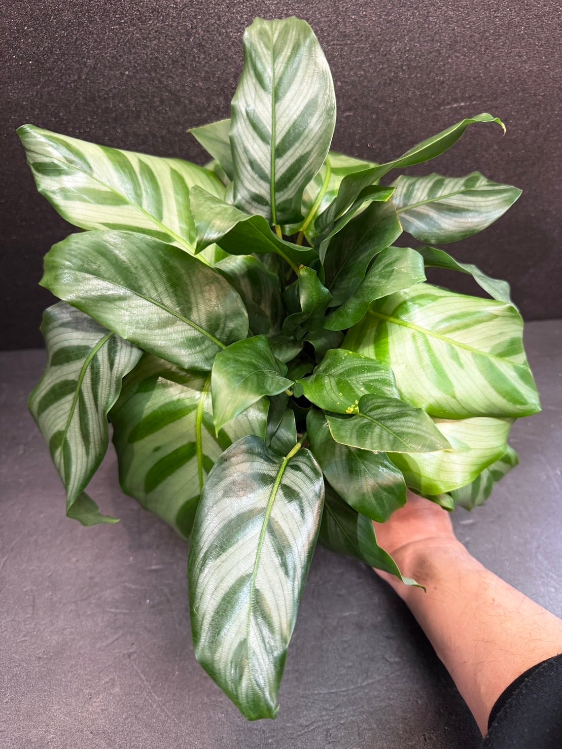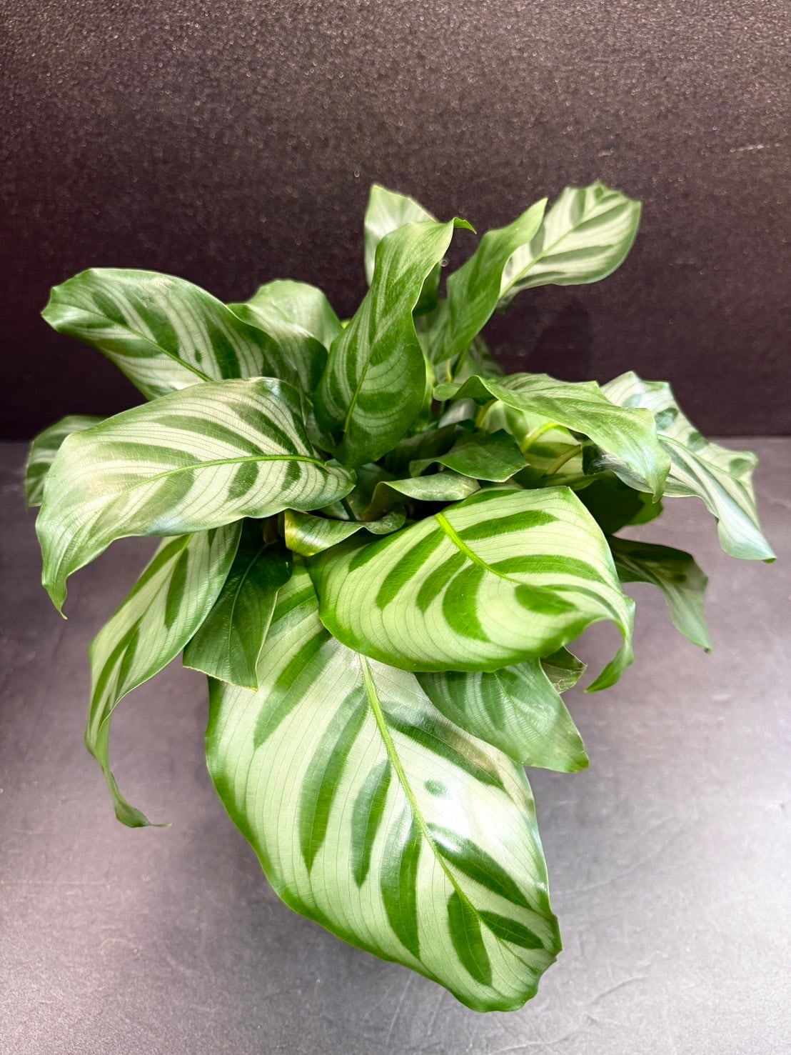 カラテア・フレディは、葉の色が濃い緑色と薄い黄緑色の二色で構成されており、葉の中に植物のイラストを描いたような個性的な模様が出来る所が魅力的な植物です。