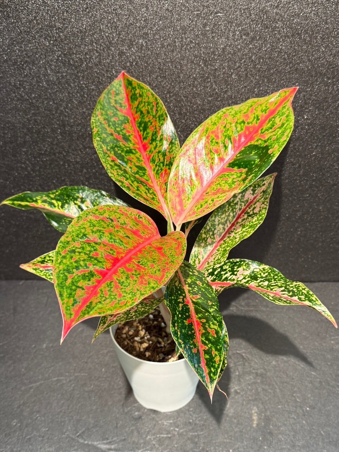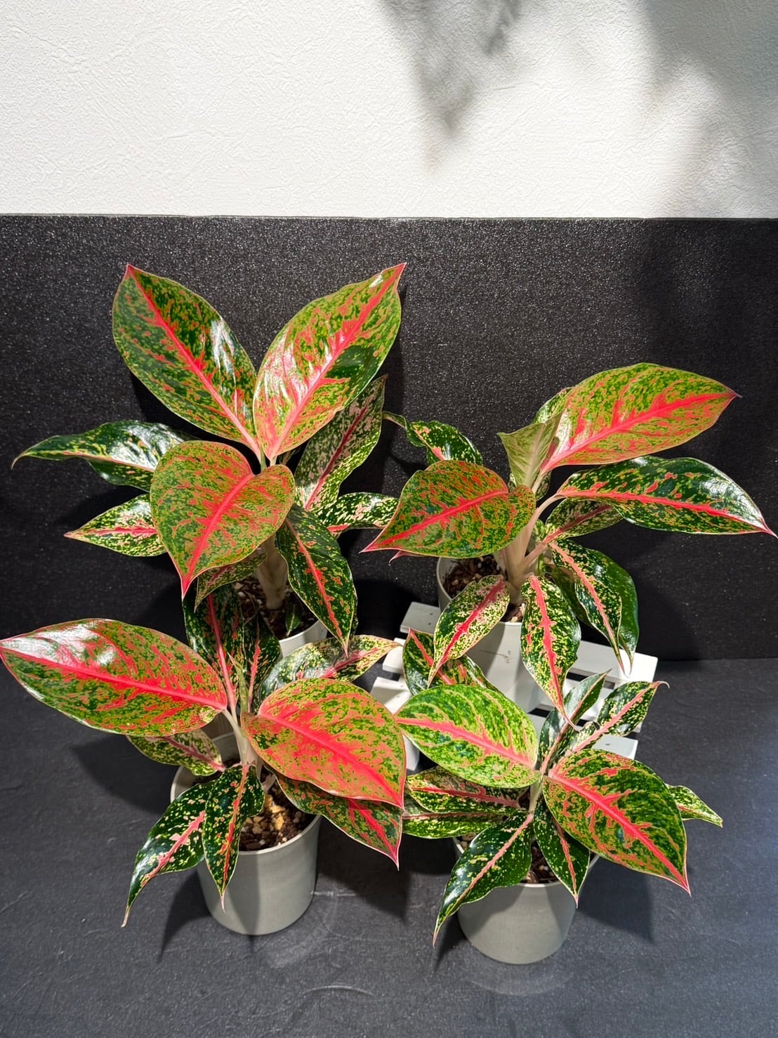 アグラオネマ・ナイトスパークルは、葉の色が緑色・黄色・赤色の三色で構成されており、葉の主脈に赤色の班が入り、葉の中に細かい黄色の散班が入るのが特徴の品種です。