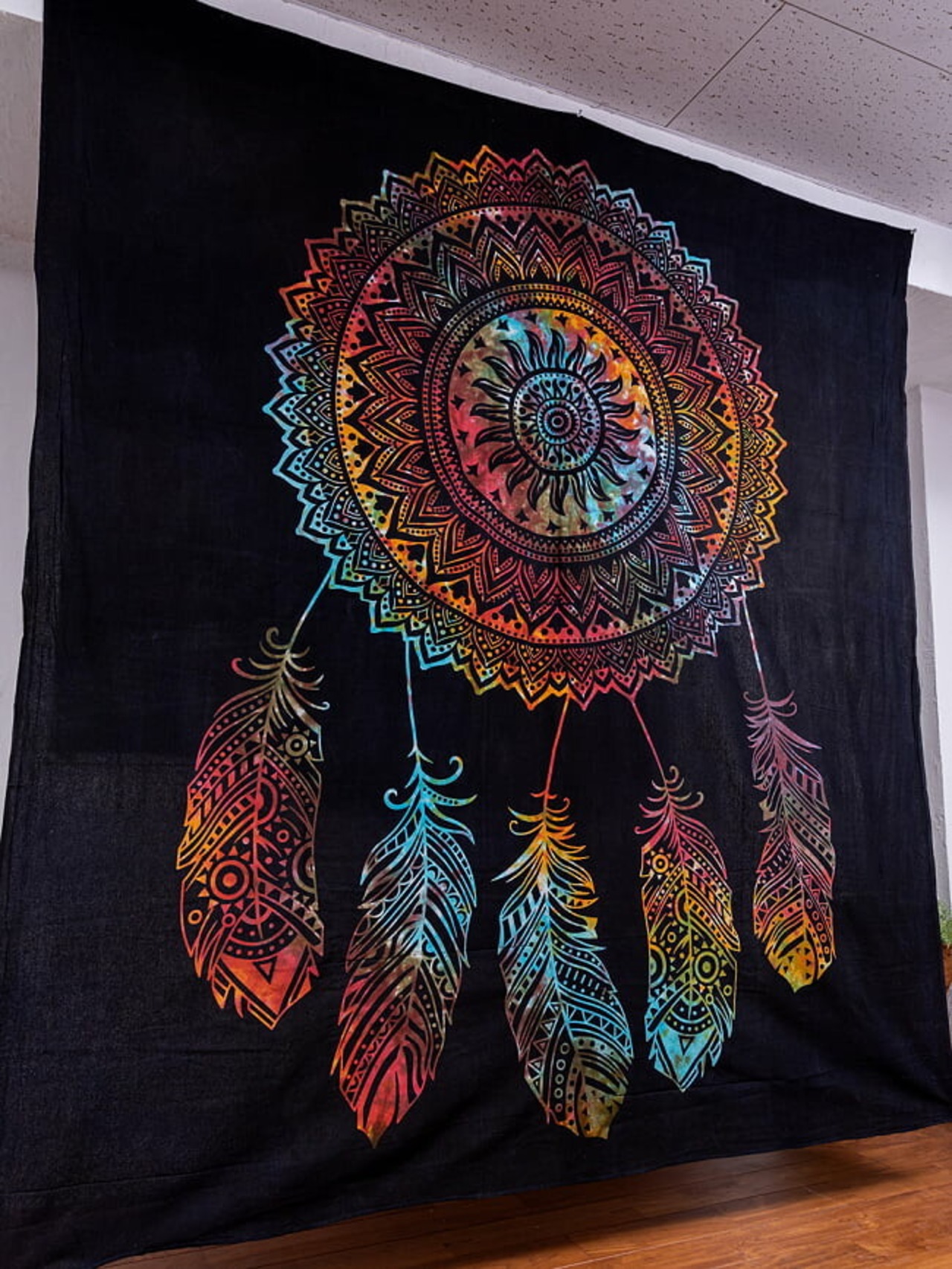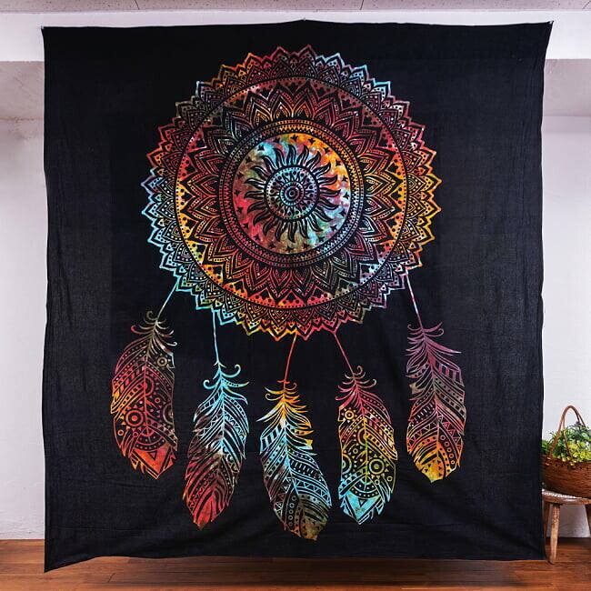 大きな布にとても丁寧にインド伝統の唐草柄やマンダラ柄、象さんやお花などがプリントされているので、こちら1枚をお部屋に飾るだけでアジアンなお部屋に大変身!